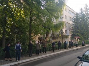 Coada la CAR Pensionari se întindea pe zeci de metri, oamenii ocupând atât aleea de acces în scara de bloc în care își are sediul instituția financiară nebancară, cât și un trotuar de pe Maxim Gorki.