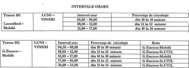Astfel, autobuzele, care vor fi achiziționate în leasing operațional, vor circula pe aceleași trasee ca și tramvaiele, adică 101 și 102, în intervale de timp de la 10 minute în orele de vârf la 15 minute. Primul autobuz va ieși din garaj la ora 4,52 și va efectua ultima cursă, de la capete, la ora 23.00.