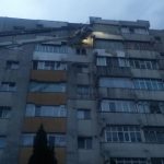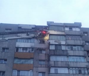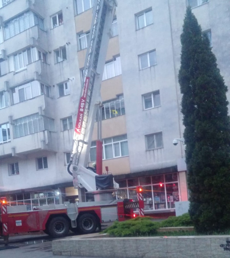 Pompierii din Botoșani intervin, joi seară, pentru pe Pietonalul Bancar din municipiu pentru înlăturarea elementelor de construcție de pe fațada unui bloc din Piata Revoluției.