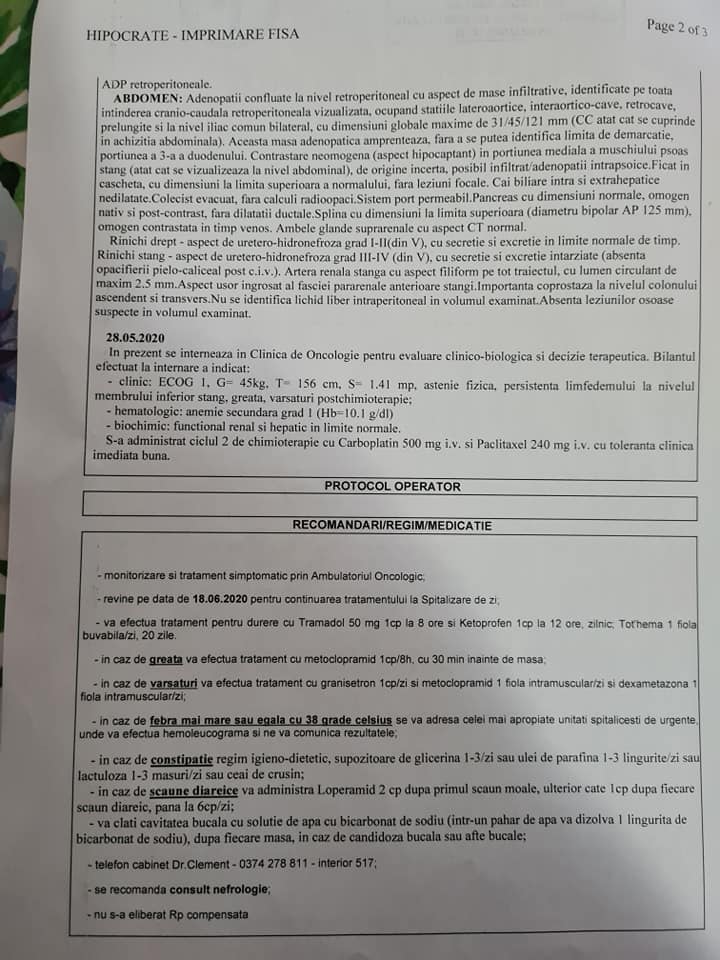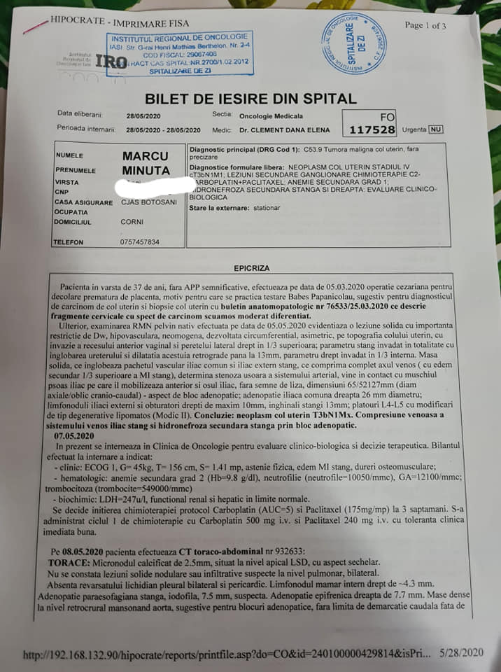 După naştere au revenit durerile foarte mari de picior, de burtă şi spate şi a aflat că ar avea cancer de col uterin. A aşteptat o lună, dar, vâzând că se simte din ce în ce mai rău, a fost trimisă la Iaşi, dacă vrea să-şi vadă fetiţele crescând. La Iaşi a aflat că are o tumoare extinsă, care nu se poate opera, deocamdată. I s-a prescris tratament cu citostatice, iar pe 28 mai a făcut a doua şedinţă de citostatice.