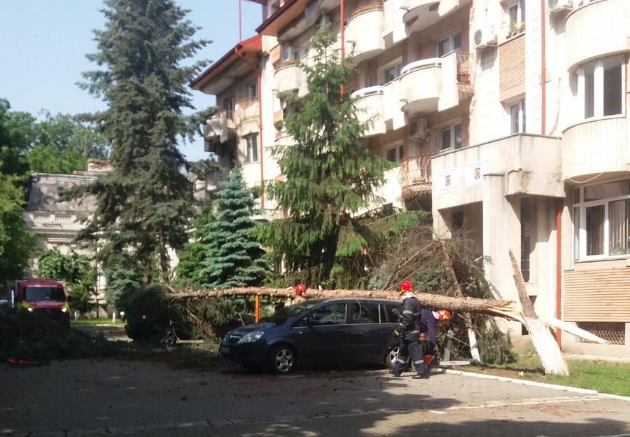 Două mașini au fost avariate în parcarea Hotelui Maria din municipiul Botoșani, după ce un copac a căzut peste ele. Un brad de mari dimensiuni a fost rupt de furtuna din noaptea de vineri spre sâmbătă, arborele căzând peste cele două autoturisme aflate în parcarea din zona Pietonalului Unirii.