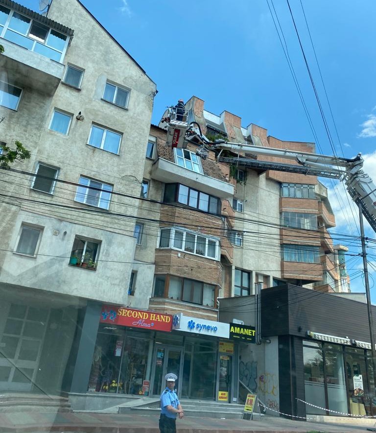 Pompierii au intervenit cu o scară și au îndepărtat tencuiala care punea probleme.