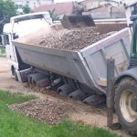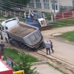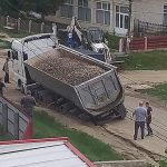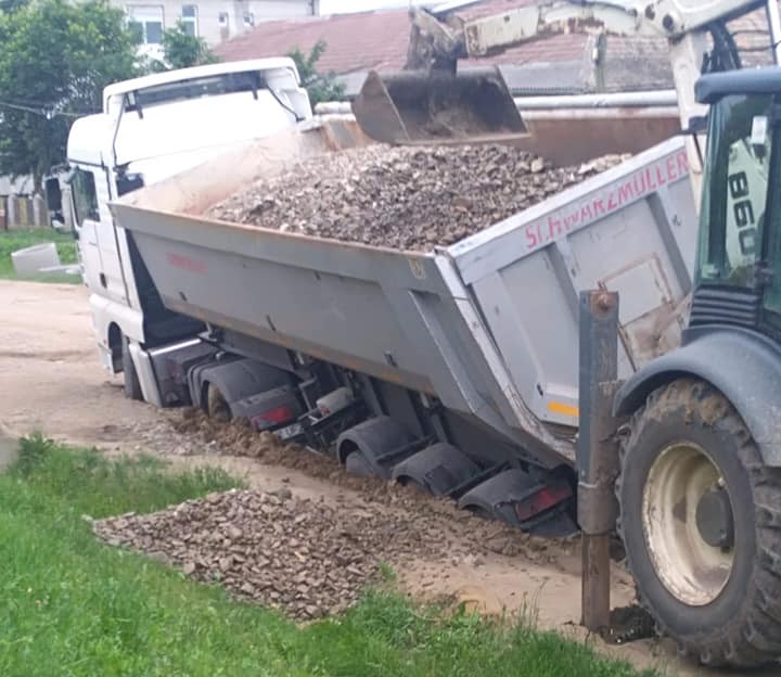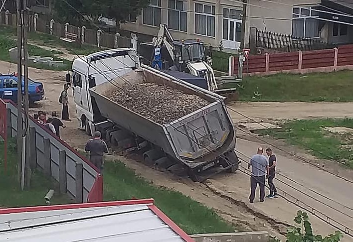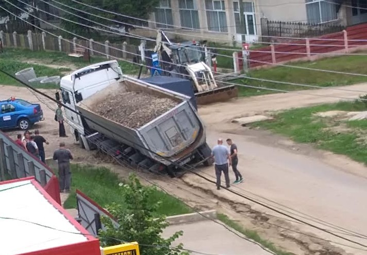 Un camion încărcat cu pietriș a rămas blocat pe un drum din localitatea Dângeni, joi. Autovehiculul a intrat efectiv cu roțile din partea stângă în pământ și nu și-a mai putut continua drumul.