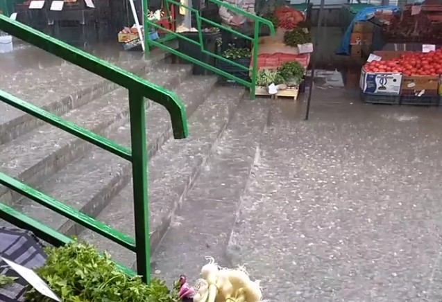 Piața din Dorohoi a fost inundată, joi, după o rupere de nori de câteva minute. Apa a ajuns ușor printre tarabele oamenilor.