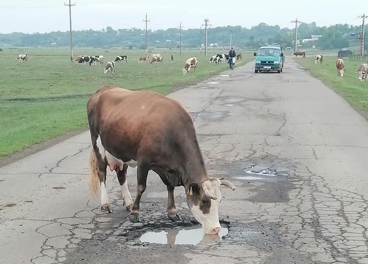 Imaginea, realizată de Dumitru Cristian Andrioaie, a fost suprinsă pe drumul județean DJ 282, între localitățile Todireni și Hlipiceni, acolo unde gropile din asfalt sunt atât de adânc încât s-au transformat în adăpătoare pentru animale.