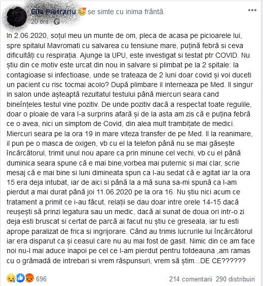 „In 2.06.2020, soțul meu un munte de om, pleca de acasa pe picioarele lui, spre spitalul Mavromati cu salvarea cu tensiune mare, puțină febră si ceva dificultăți cu respirația. Ajunge la UPU, este investigat si testat ptr COVID. Nu știu din ce motiv este urcat din nou in salvare si plimbat pe la 2 spitale: la contagioase si infectioase, unde se trateaza de 2 luni doar covid și voi duceti un pacient cu risc tocmai acolo? După plimbare il interneaza pe Med. II singur in salon unde așteaptă rezultatul testului până miercuri seara cand bineînțeles testul vine pozitiv. De unde pozitiv dacă a respectat toate regulile, doar o ploaie de vara l-a surprins afară și de la asta am zis că e puțina febră ce o avea, nici un simptom de Covid, din alea mult trambițate de medici”, spune botoșăneanca.