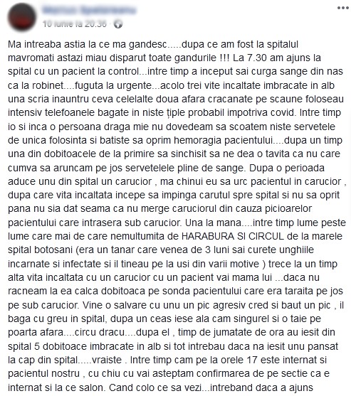 „Între timp a inceput sa-i curga sange din nas ca la robinet, fuguta la urgente, acolo trei v… incaltate imbracate in alb, una scria inauntru ceva, celelalte doua afara cracanate pe scaune foloseau intensiv telefoanele bagate in niste țiple probabil impotriva Covid. Intre timp eu si inca o persoana draga mie nu dovedeam sa scoatem niste servetele de unica folosinta si batiste sa oprim hemoragia pacientului. Dupa un timp una din d…. de la primire s-a sinchisit sa ne dea o tavita ca nu care cumva sa aruncam pe jos servetelele pline de sange. Dupa o perioada aduce unu din spital un carucior, ma chinui eu sa urc pacientul in carucior, dupa care v…. incaltata incepe sa impinga carutul spre spital si nu s-a oprit pana nu si-a dat seama ca nu merge caruciorul din cauza picioarelor pacientului care intrasera sub carucior”, povestește bărbatul.