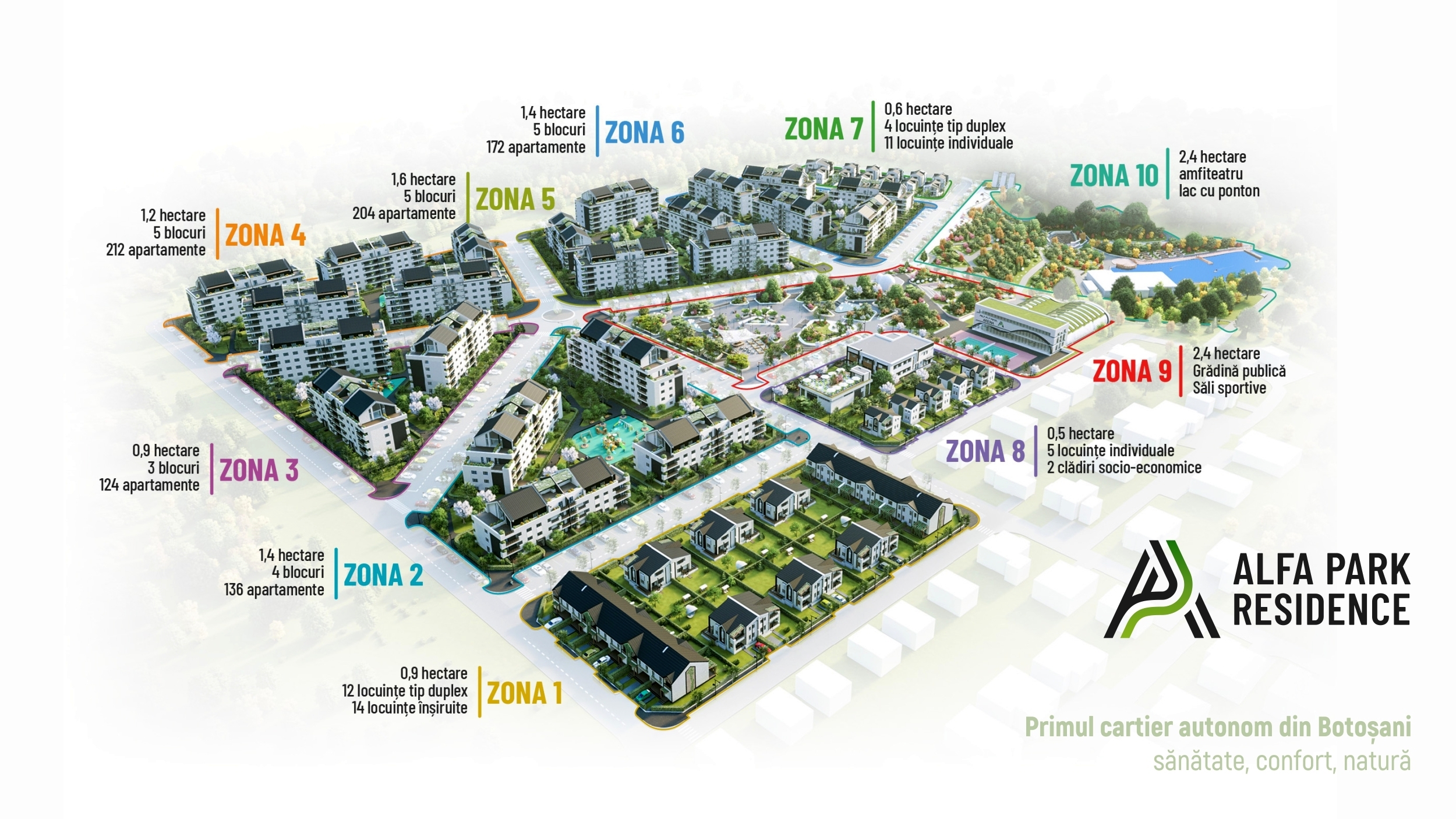Noul cartier va prinde contur progresiv, întregul proiect dezvoltându-se în etape de realizare aferente a zece zone rezidențiale. Complexul va îngloba 848 apartamente și 46 case (22 locuințe colective, 16 locuințe individuale, 14 locuințe înșiruite, 16 locuințe tip duplex), 864 locuri de parcare, spații comune pentru servicii comerciale si de alimentație publică, spații de învățământ,medicale si sportive (sala fitness, teren de baschet si bazin de înot acoperit), precum și spații verzi, parcuri interioare, alei și parcaje, spații de agrement și relaxare, toate acestea fiind integrate într-un concept unitar arhitectural și funcțional – pentru sănătate, confort, natură!
