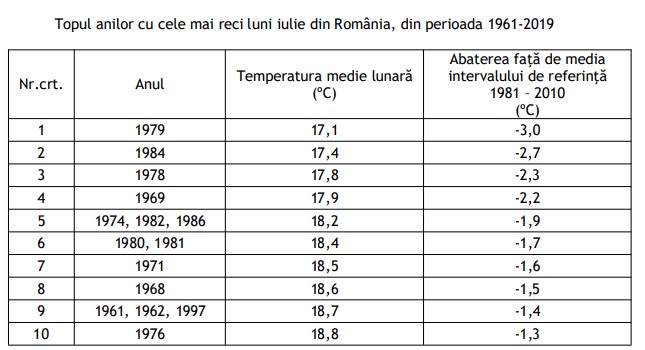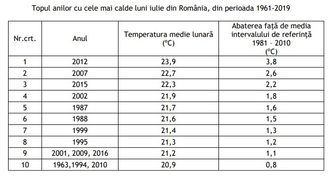Din datele înregistrate în perioada 1961–2019 la stațiile meteorologice din reţeaua Administraţiei Naţionale de Meteorologie, temperatura medie lunară multianuală (1961-2019) depăşeşte 22,0ºC în Câmpia Română şi în Dobrogea, iar în estul şi centrul Moldovei, în zonele deluroase ale Olteniei şi Munteniei, în Câmpia Vestică, în dealurile din Banat şi Crişana şi în