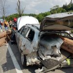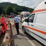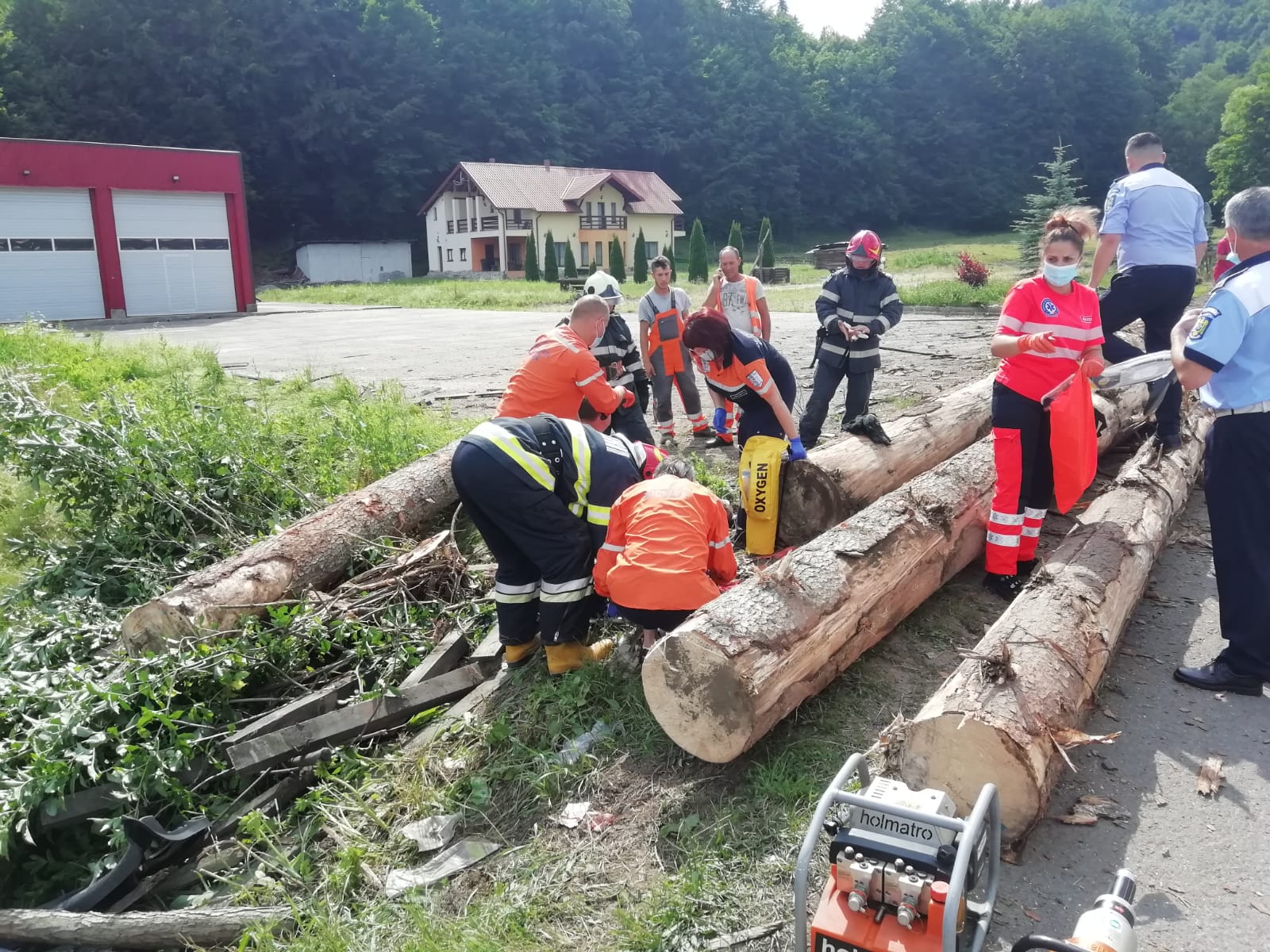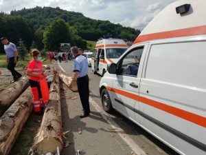 Mai mulţi buşteni, din remorca unui autocamion încărcat cu lemne, s-au desprins într-o curbă şi au căzut pe carosabil. În cădere, trunchiurile au surprins şi au rănit trei persoane. O femeie de 50 de ani şi un minor de 10 ani, se aflau pe marginea drumului, unde se opriseră cu maşina, deoarece aceasta se defectase. De asemenea, lemnele au avariat şi autoturismul. Cea de-a treia persoană rănită, un bărbat de 52 de ani, se afla şi el pe marginea drumului, când a fost surprins de lemnele căzute.
