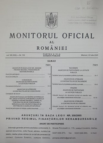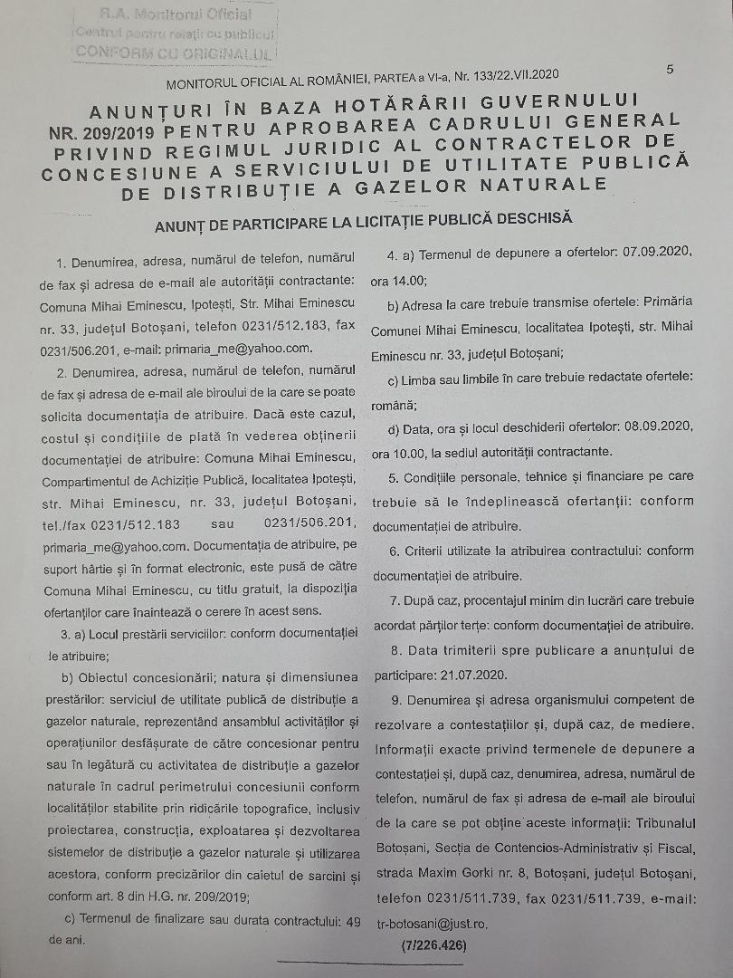 Primăria comunei Mihai Eminescu aduce la cunostinta ca ANUNTUL DE PARTICIPARE LA LICITATIE PUBLICA DESCHISA – CONCESIUNE A SERVICIULUI DE UTILITATE PUBLICA DE DISTRIBUTIE A GAZELOR NATURALE este publicat in data de 22.07.2020 in Monitorul Oficial al Romaniei, in partea a VI-a – Achizitii publice, cu nr. anunt 133 si pe site-ul institutiei http://mihaieminescu.botosani.ro/.