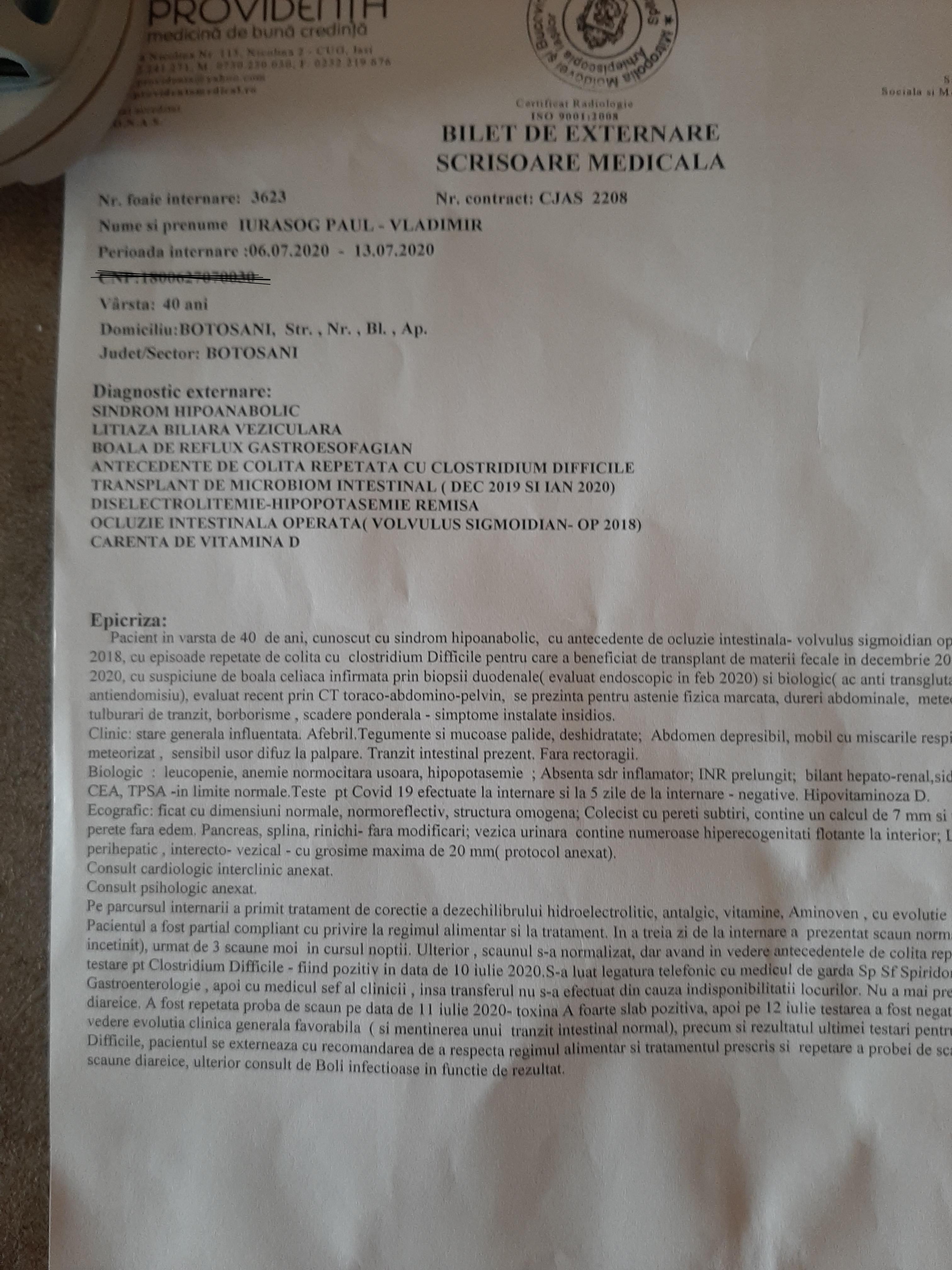 Totul a început în 2018, când a mers la Spitalul Județean din Botoșani pentru o operație, avea „Ocluzie intestinală, Volvulus de sigmoidanul”. Anul trecut, după un tratament cu antibiotice, acesta a luat din spital Clostrudium.