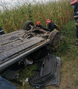 Autoturismul în care se afla preotul a lovit un stâlp, apoi s-a răsturnat pe cupolă lângă un lan de porumb.