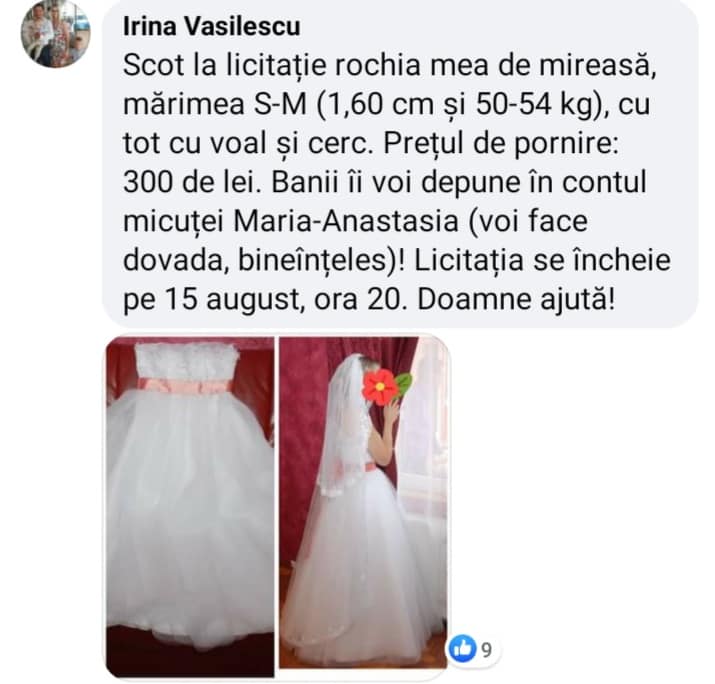 „Se va trimite rochița de mireasa castigatorului din comentariile de la această postare care oferă cea mai mare sumă, iar la finalul licitației va face dovada plății în conturile mamicii TUCHIAC Mariana deschise la Banca Transilvania”, spune Simona Elena.