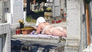 Temperaturile caniculare din România înregistrate în ultimele zile au făcut-o pe o femeie din Alba Iulia să facă plajă într-un cimitir din oraş, chiar pe o piatră de mormânt. Fotografia în care este surprinsă femeia a ajuns în redacția Alba24, fiind surprinsă de o femeie din localitate. „Așa se stă ziua la prânz, în cimitir: la plajă. În zona Ampoi III, la cimitirul Chip”, este comentariul celei care a făcut poza.