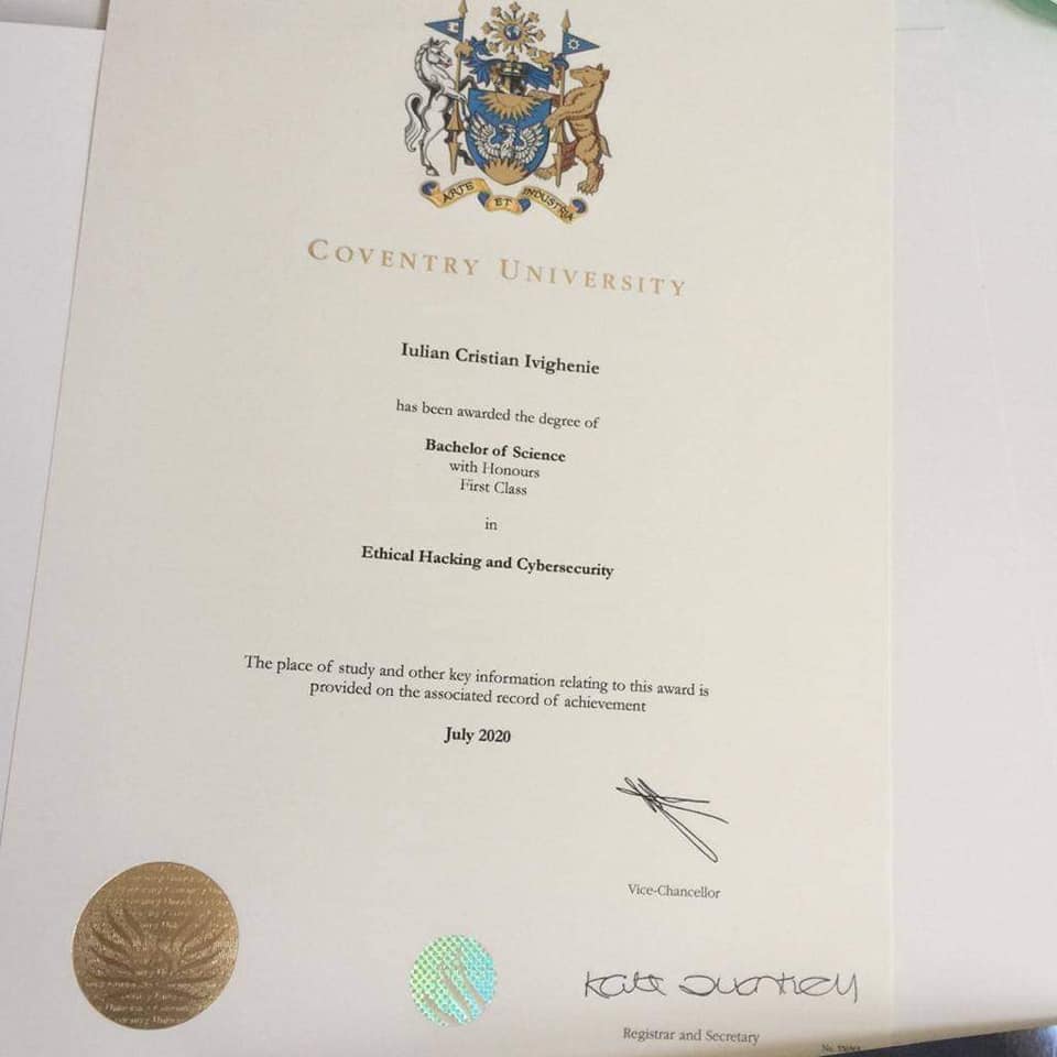 După ce a terminat Cibernetica la Coventry University cu Honours First Class, datorită rezultatelor sale, tânărul a primit o bursă pentru a face master în Software Development.