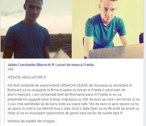 „Am fost contactat de acest individ URSACHI CEZAR din Suceava cu domiciliul in Botosani, sa se angajeze la firma noastra cu lucrari in Franta. A cerut bani de drum, mancare, i-am comandat bilet din Romania pana in Franta si nu s-a prezentat. Am pagubit nervi si timp, impreuna cu 300 de euro pe care i-am trimis si nu o sa-i mai vad. Modul lui de lucru este sa ceara cate 100 de euro si apoi spune ca nu au ajuns in cont si să retrimit inca o data, inca o data. Sper sa nu fiti la fel de prosti ca mine si sa nu incurajam specimene de genul care ne fac de rusine tara”, este mesajul angajatorului.