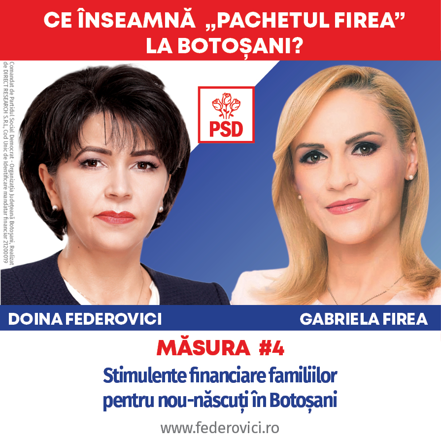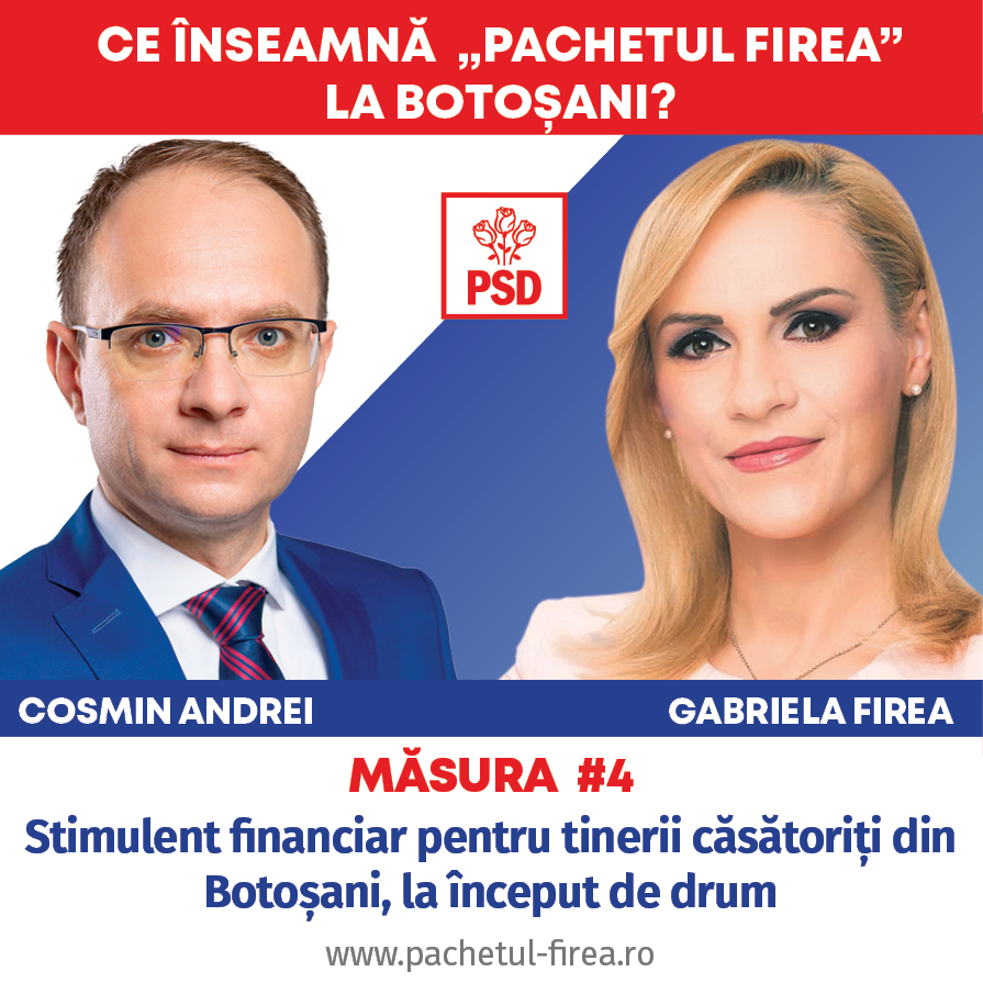 Candidații PSD la Consiliul Județean și Primăria Municipiului Botoșani au prevăzut în Programul social Gabriela Firea pentru Botoșani stimulente financiare pentru tinerii căsătoriți și pentru fiecare nou născut din municipiul și județul Botoșani.