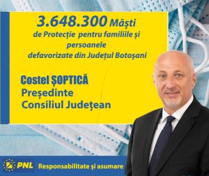 ”Este un act de normalitate să venim în ajutorul persoanelor nevoiașe și țin să precizez că județul Botoșani se află printre primele județe în care au ajuns cantitățile de măști, datorită colaborării constante dintre conducerea Instituției Prefectului și Direcției de Sănătate Publică și demersurilor făcute la nivel central. Totodată apreciez eforturile susținute ale acestor instituții, cumulate cu cele ale conducerii Spitalului Județean de Urgență Mavromati pentru că iată, la ora actuală, contextul epidemiologic din județul nostru este unul favorabil față de alte județe din țară. Asigurarea măștilor de protecție în cazul categoriilor de persoane defavorizate reprezintă o măsură de protecţie sanitară cu scopul de a limita infectarea cu coronavirus și de a reduce expunerea comunităţilor la riscul îmbolnăvirii” , a mai precizat Costel Șoptică, candidatul PNL la funcția de Președinte al Consiliului Județean.