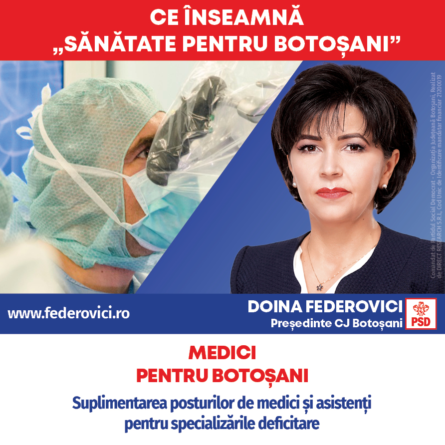 „Împreună cu echipa de specialiști în sănătate și cu toți consilierii județeni am pregătit cel mai mare program pentru realizarea de investiții în infrastructura medicală din Botoșani. Vom continua toate obiectivele din domeniul sanitar pe care le-a început echipa PSD la Consiliul Județean și care au fost susținute de Guvernarea social-democrată, prin Programul „Sănătate pentru Botoșani”. Acest lucru înseamnă, că vom achiziționa aparatură medicală avansată pentru toate secțiile interioare și exterioare de la Spitalul Mavromati și vom finaliza reabilitarea clădirilor pentru secțiile de Pediatrie, Obstetrică-Ginecologie, Urgențe și Ambulatoriul de zi”, a declarat Doina Federovici.
