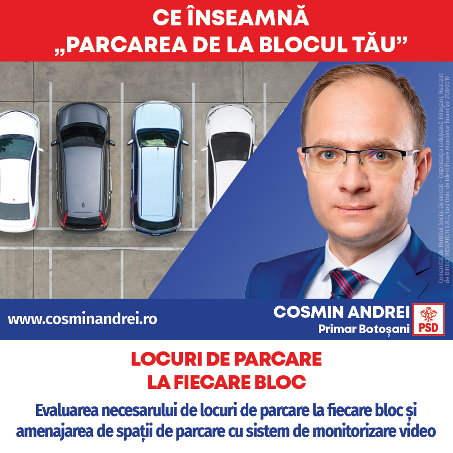 „E timpul pentru o schimbare! O prioritate a mandatului meu este să ofer botoșănenilor un spațiu modern, civilizat, sigur și la îndemână pentru parcarea mașinilor în spații dedicate. Știu ce este de făcut, am identificat locurile și urmează să mă apuc de treabă după 27 septembrie! Vă aștept alături de mine pentru a face prima schimbare la primărie și apoi să ne ocupăm împreună de viitorul municipiului Botoșani!”, a concluzionat Cosmin Andrei.