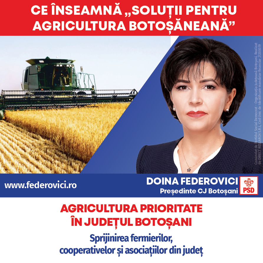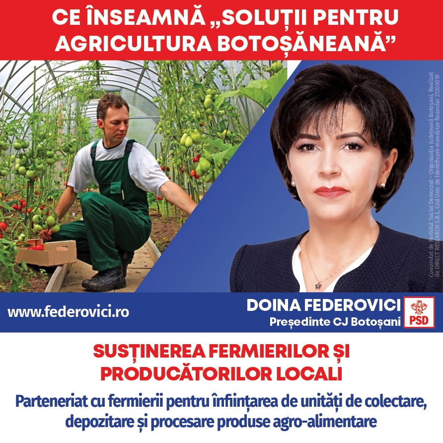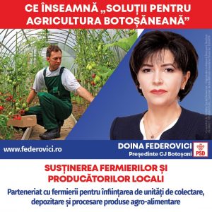 „Am pregătit alături de colegii mei un program pentru următorii 4 ani, dedicat finanțării domeniului agricol și sprijinirii fermierilor, cooperativelor și asociațiilor agricole din județ în vederea înființării de unități de colectare, depozitare, procesare și comercializare pentru produsele agro-alimentare ale producătorilor locali. Nu voi accepta nicio întârziere în implementarea acestor măsuri prin care să promovăm agricultura din județul nostru și toți fermierii botoșăneni care muncesc pământul pentru a produce hrană sănătoasă pe care noi să o punem pe masă”, a declarat Doina Federovici.