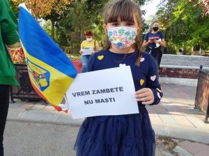 “Vrem zâmbete nu măşti”, “Vrem să respirăm, nu să ne mascăm”, “Fără mască în şcoli”, sunt doar câteva din mesajele imprimate pe foi, cu care protestatarele au venit în faţa primăriei, copiii la rândul lor având baloane inscripţionate cu “Stop mască” dar şi mici drapele ale României.