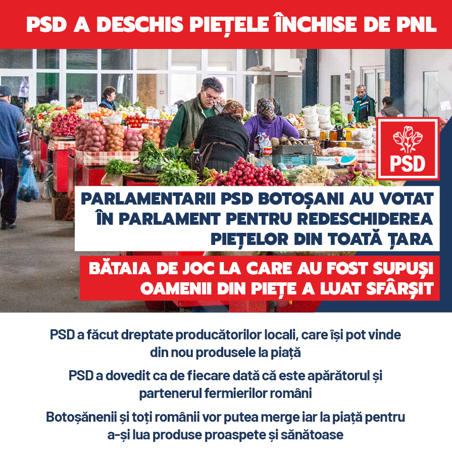 „Așa cum ne-am mobilizat acum în Parlament cu apărarea drepturilor producătorilor locali și a fiecărui botoșănean de a pune pe masă produse naturale din grădinile țăranilor, la fel vom face și după 6 decembrie dacă vom primi votul de încredere al oamenilor. Este nevoie de o guvernare PSD care să se preocupe cu adevărat de fermierii români, așa cum s-a întâmplat în perioada 2017-2019. Bătaia de joc la care au fost supuși oamenii din piețe a luat sfârșit. PSD a făcut dreptate producătorilor locali, care își pot vinde din nou produsele la piață. PSD a dovedit ca de fiecare dată că este partenerul fermierilor români. Botoșănenii și toți românii vor putea merge iar la piață pentru a-și lua produse proaspete și sănătoase, dacă Klaus Iohannis nu blochează legea la promulgare, așa cum a făcut cu toate beneficiile pe care PSD le-a votat pentru români”, au anunțat parlamentarii PSD Botoșani.