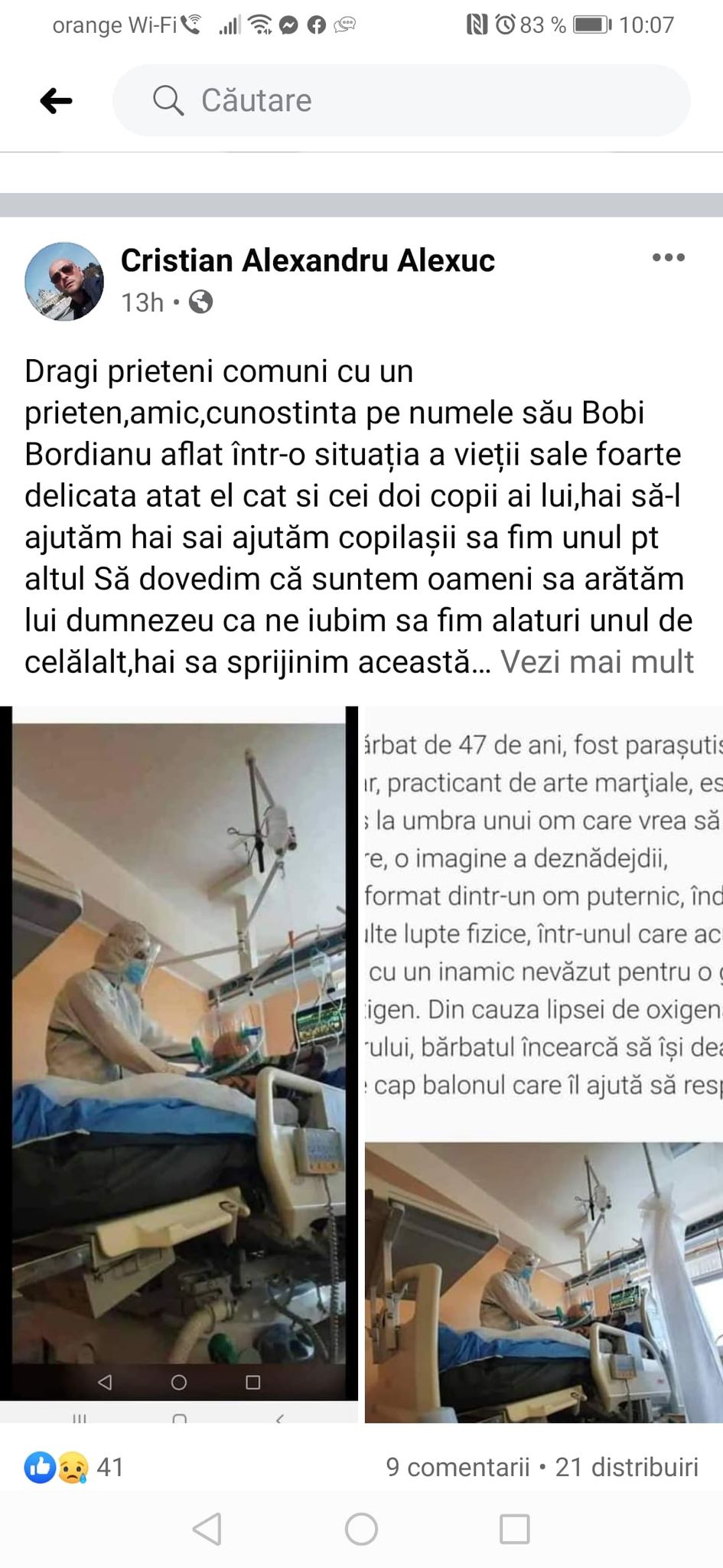 „Dragi prieteni comuni cu un prieten, amic, cunostinta pe numele său Bobi Bordianu aflat într-o situația a vieții sale foarte delicata atat el cat si cei doi copii ai lui, hai să-l ajutăm hai sai ajutăm copilașii sa fim unul pt altul, Să dovedim că suntem oameni sa arătăm lui dumnezeu ca ne iubim sa fim alaturi unul de celălalt,hai sa sprijinim această familie cum putem ,poate unii dintre voi stiti, Bobi se află pe patul de spital răpus de acea boală cruntă ce se poate abate pe fiecare dintre noi. Hai sa fim alaturi unul de celălalt, sa ne ajutam si sa nu trecem cu neputință peste durerea fiecaruia,va multumesc!!sa ne rugam pt el pt fam.lui.”, este mesajul transmis de Cristian Alexandru Alexuc.