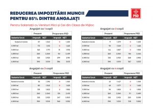 Programul fiscal propus de PSD prevede creșterea salariilor la 85% dintre angajații din România prin impozit ZERO la salariul minim și scăderea impozitării la salariații cu copii și la cei cu veniturile sub 6.000 de lei pe lună. De asemenea, va fi impozit ZERO pe bonurile de masă primite de angajați prin includerea acestora în categoria veniturilor neimpozabile.