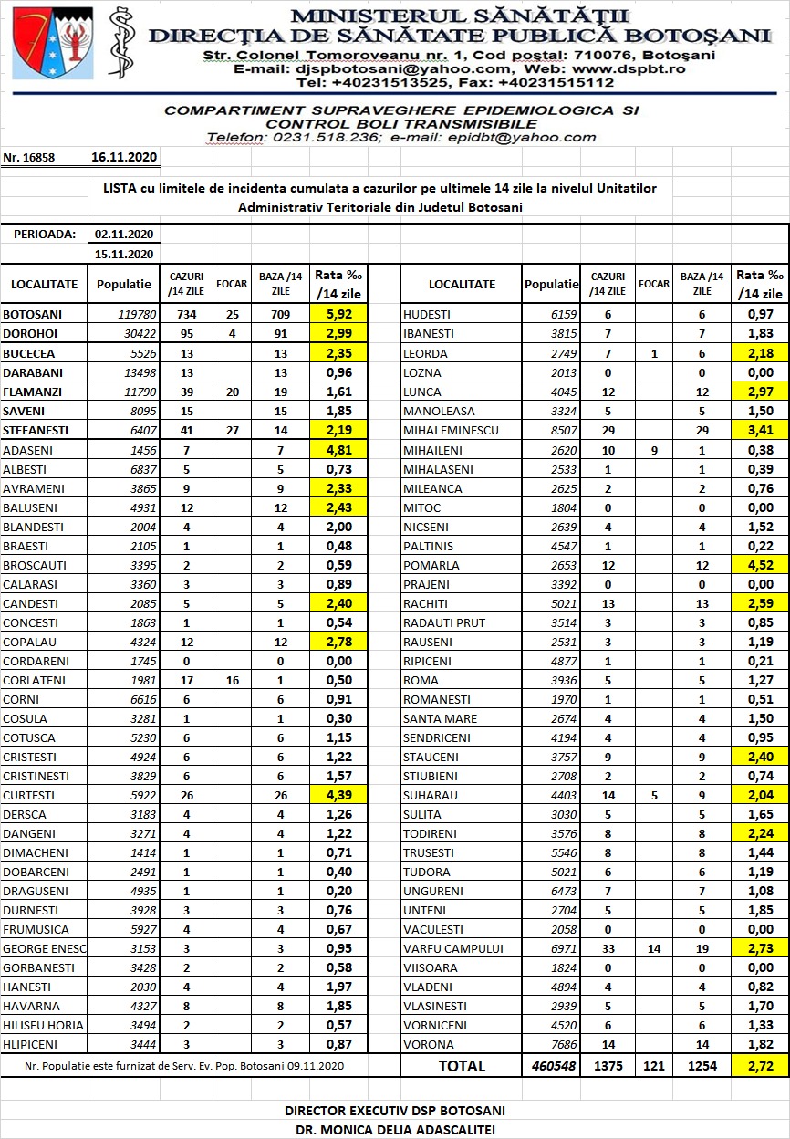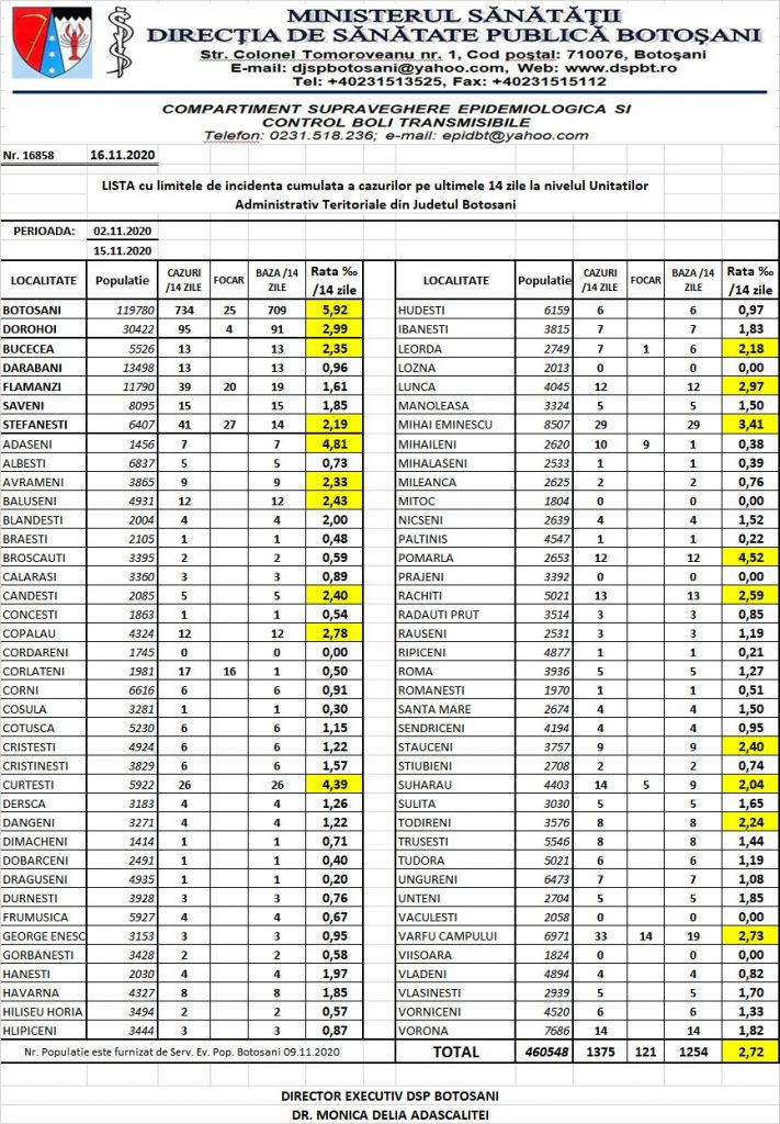Iată lista cu limitele de incidență cumulată a cazurilor pe ultimele 14 zile la nivelul unităților administrativ teritoriale din județul Botoșani: