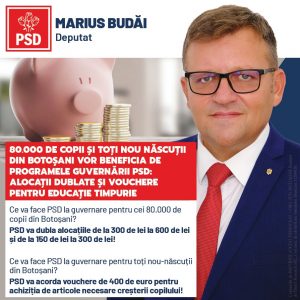 Deputatul social-democrat botoșănean, Marius Budăi a anunțat astăzi că PSD, spre deosebire de toate celelalte partide vine cu măsuri concrete pentru stimularea natalității și sprijin pentru educația timpurie.