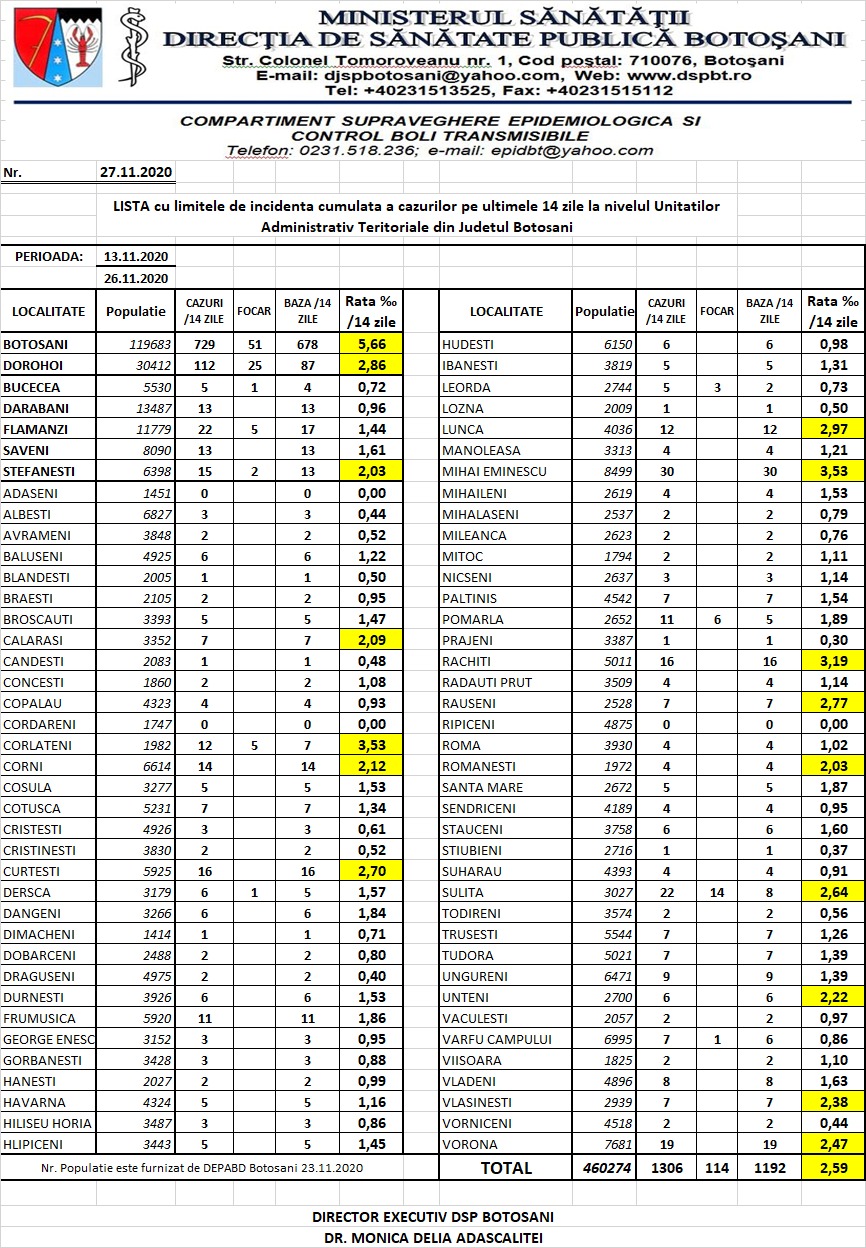 Iată lista cu limitele de incidență cumulată a cazurilor pe ultimele 14 zile la nivelul unităților administrativ teritoriale din județul Botoșani: