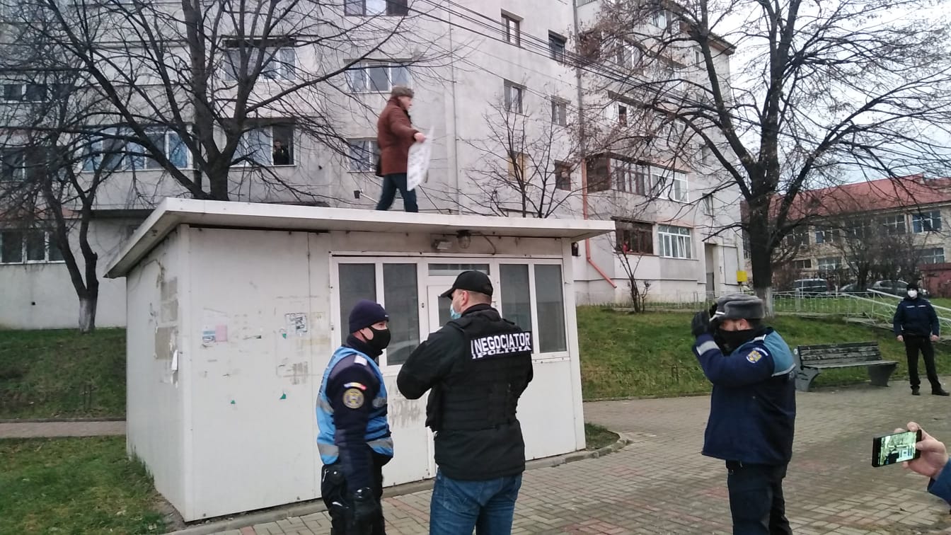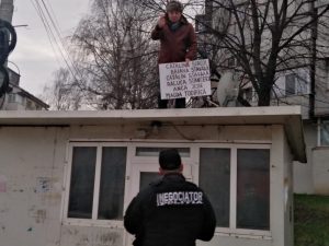 Protest la înălțime la Botoșani! Un bărbat de 58 de ani amenință că se aruncă în cap de pe un chioșc dacă la fața locului nu vin reprezentanți ai Primăriei și ai Direcției de Impozite și Taxe.