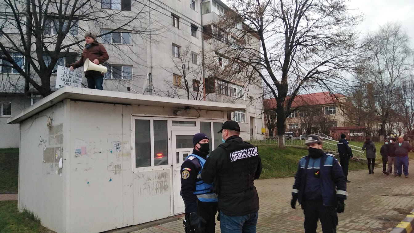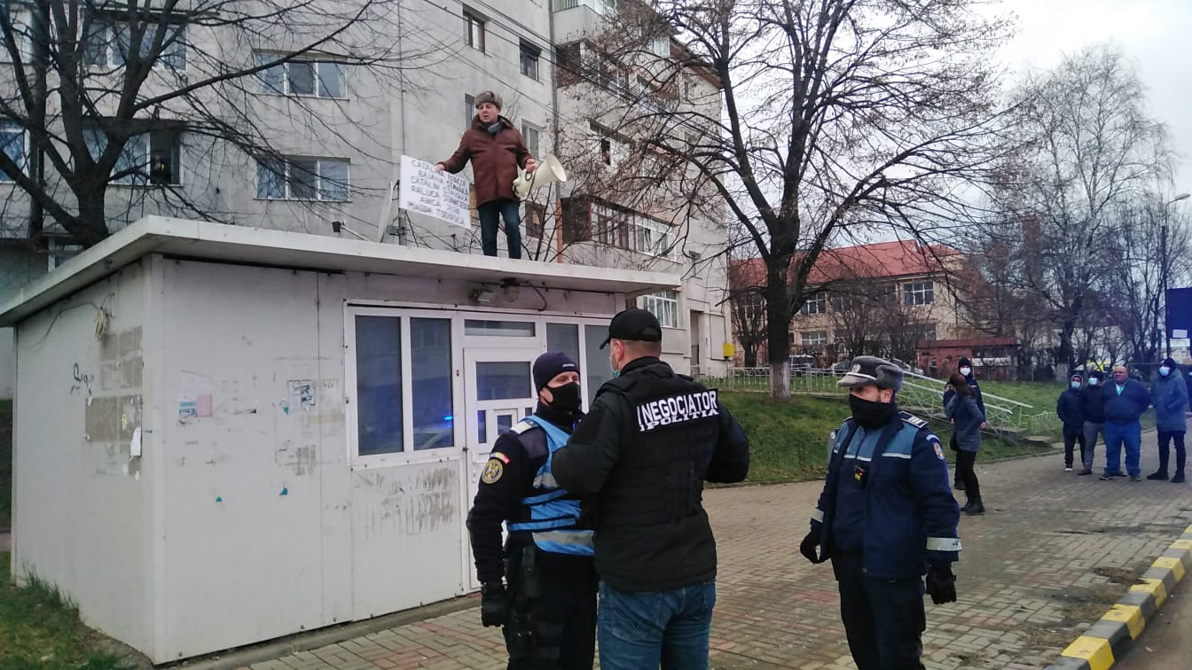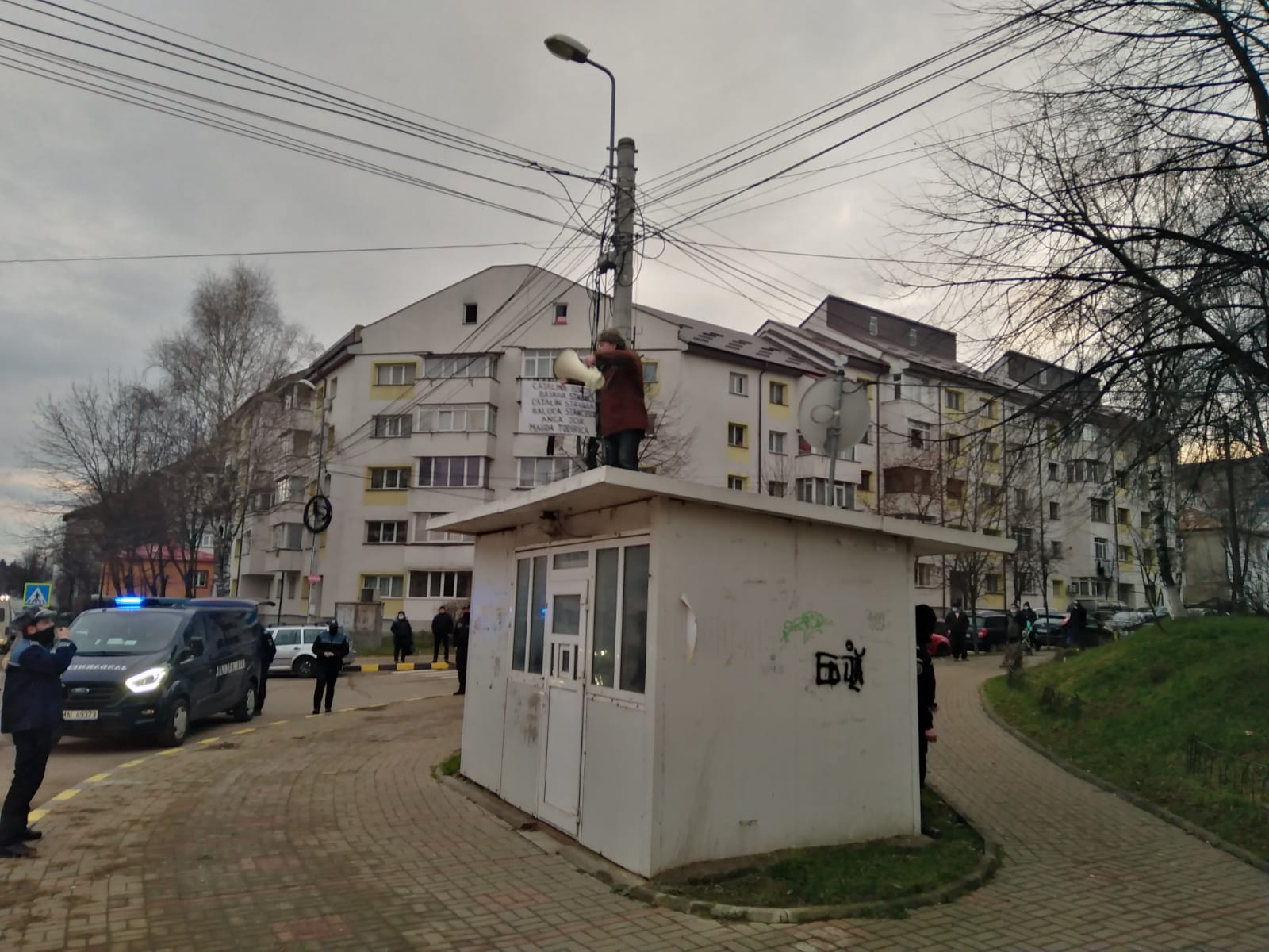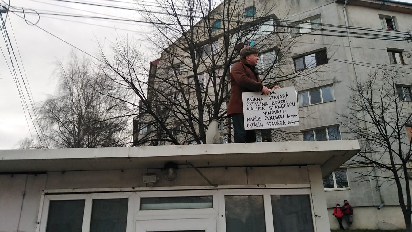 Este vorba despre tatăl lui Cătălin Stavără, iubitul fostului prim procuror Raluca Stâncescu, condamnată într-un dosar de corupție. Acesta s-a urcat pe un chioșc de la intersecția dintre străzile Tudor Vladimirescu și Săvenilor. „Înarmat” cu pancarde cu diverse mesaje, omul protestează sub supravegherea jandarmilor.