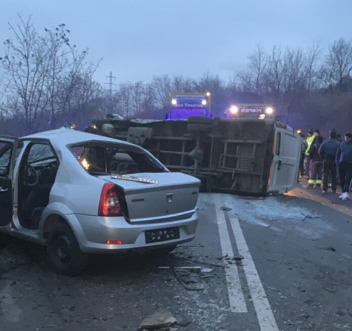Un accident cumplit a avut loc, sâmbătă dimineață, la Onești. Un microbuz în care erau 17 persoane s-a răsturnat după impactul cu un autoturism. Centrul Infotrafic din Inspectoratul General al Poliției Române anunța că, din cauza unui accident în care au fost implicate un autoturism și un microbuz, circulația este întreruptă pe DN 11 Bacău – Onești. Conform ISU Bacău, în accident nu au fost persoane încarcerate. În microbuz se aflau 17 persoane, iar în autoturism două persoane.