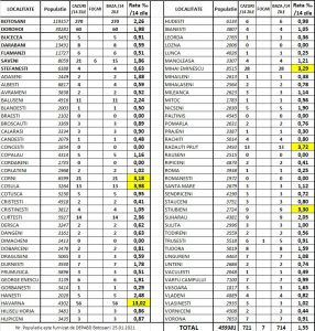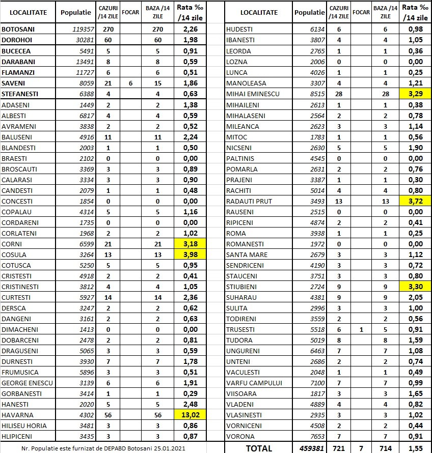 La polul opus, comuna Havârna are rata de infectare de 13,02 la mia de locuitori, Corni-3,18, Coșula-3,98, Mihai Eminescu-3,29, Rădăuți Prut-3,72, Știubieni-3,30 la mie.