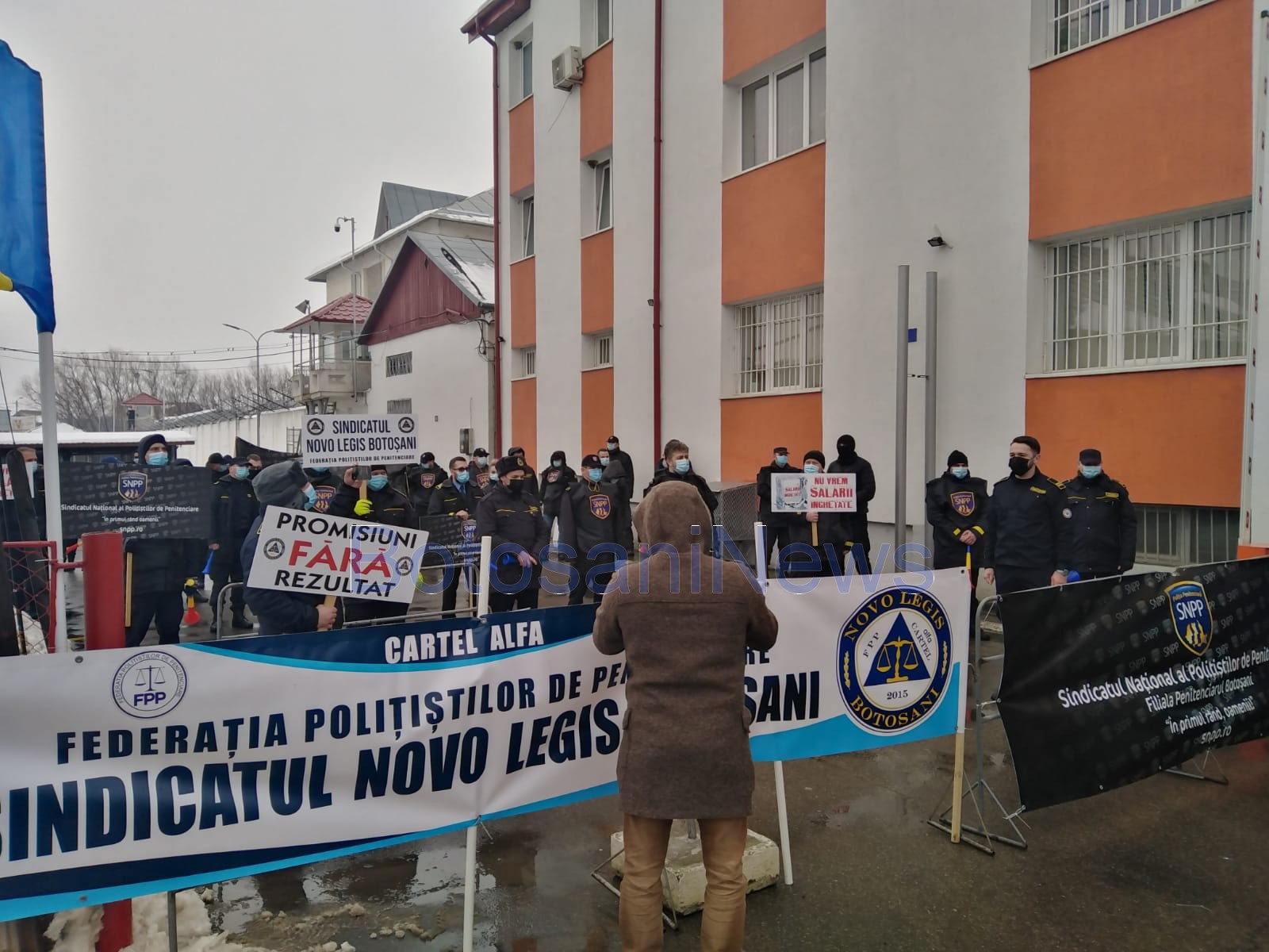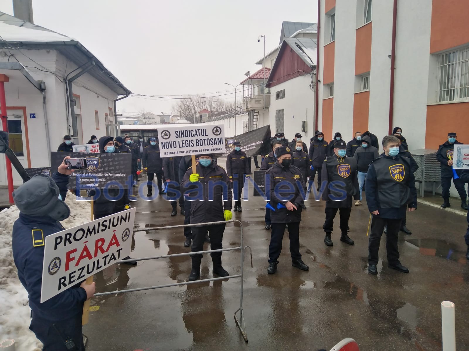 Zeci de angajați de la Penitenciarul Botoșani au protestat, joi, în fața unității de detenție. Ei au ieşit în afara unităţii şi au protestat zgomotos, în semn de nemulțumire față de nerespectarea legii de către Guvernul României. Acțiunea este organizată de Sindicatul Novo Legis Botoșani și Sindicatul Național al Polițiștilor de Penitenciare filiala Botoșani, ce reprezintă un număr de peste 280 de angajați, la care au aderat și sindicaliști din celelalte unități de detenție de la Iași sau Brăila. Protestatarii au purtat pancarte au scandat „Mincinoșii!”și „Demisia!”. Sindicaliștii solicită adoptarea statutului polițistului de penitenciare și plata orelor suplimentare.