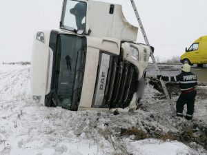 Un accident rutier a avut loc sâmbătă, în localitatea suceveană Grănicești, pe E85. Un camion încărcat cu ciocolată s-a răsturnat la marginea drumului.