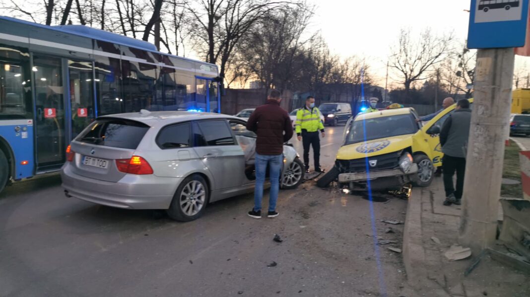 Un șofer din Botoșani a fost implicat într-un grav accident rutier care a avut loc miercuri, în municipiul Iași. Acesta conducea un autoturism BMW și a lovit un taxi, al cărui șofer, aflat sub influența alcoolului, a întors pe linie dubla continuă încercând să intre într-o stație de carburanți.