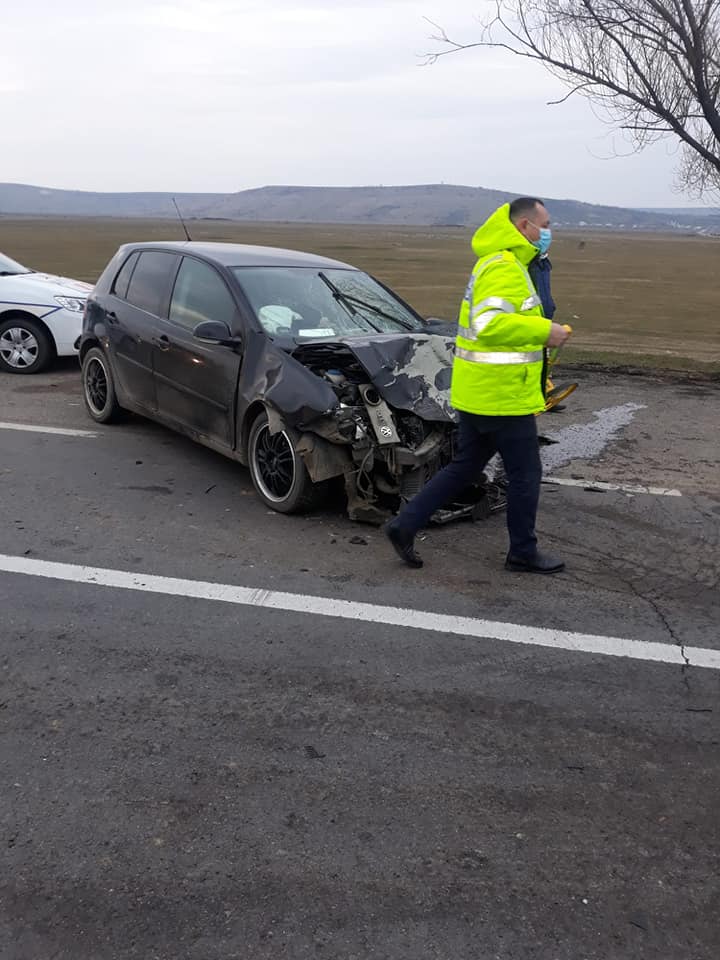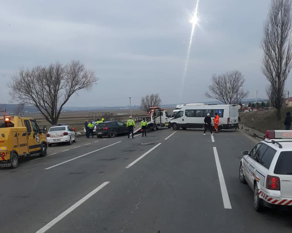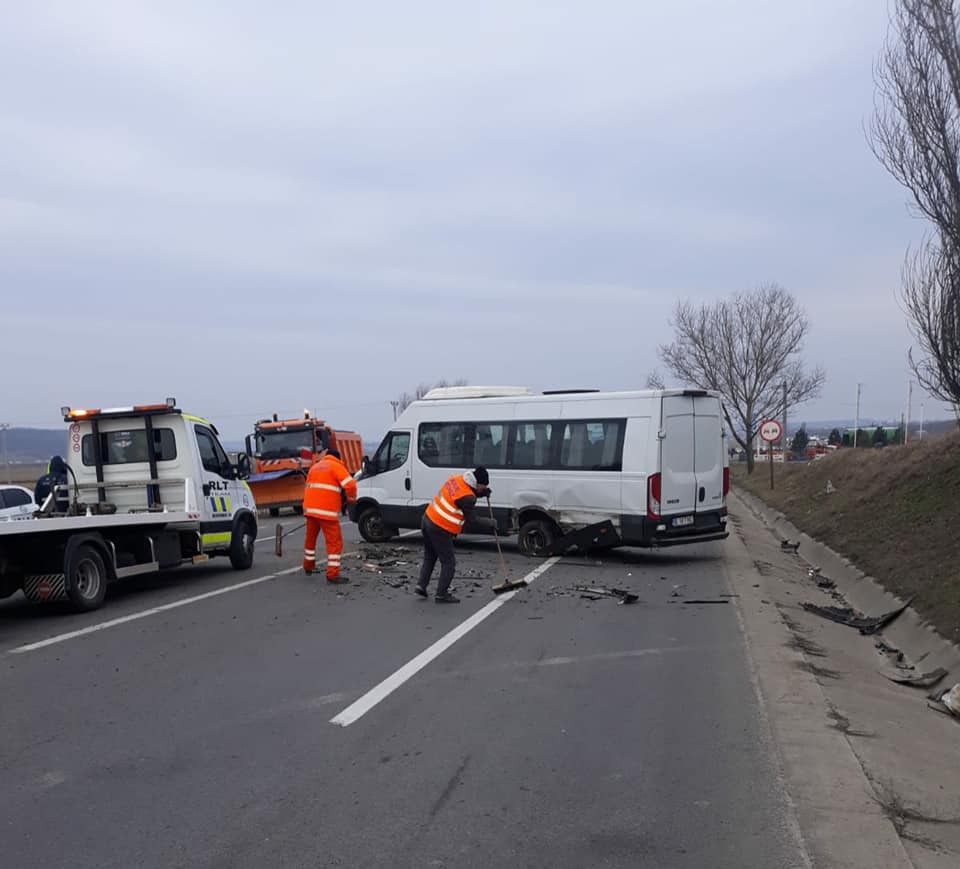 Șoferul de pe Volkswagen nu a mai avut timp să frâneze pentru a evita impactul și a lovit microbuzul în lateral spate.