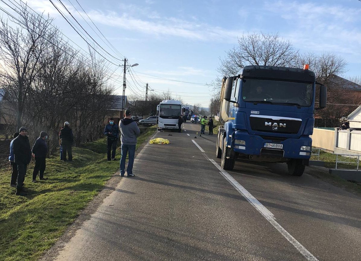 Femeia a încercat să traverseze strada în fugă, spre locuința sa, după ce a discutat cu șoferul unui autobuz. Între timp, camionul intrase în depășirea microbuzului, iar șoferul, de 50 de ani, nu a observat-o la timp pe femeie, lovind-o puternic.