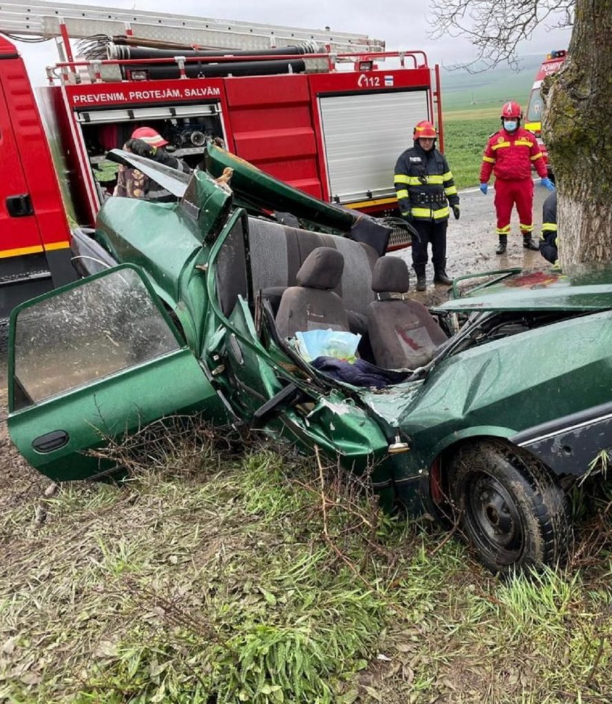 FOTO Tragedie! O femeie a murit după ce Dacia în care se afla s-a izbit într-un copac. Mașina s-a rupt în două
