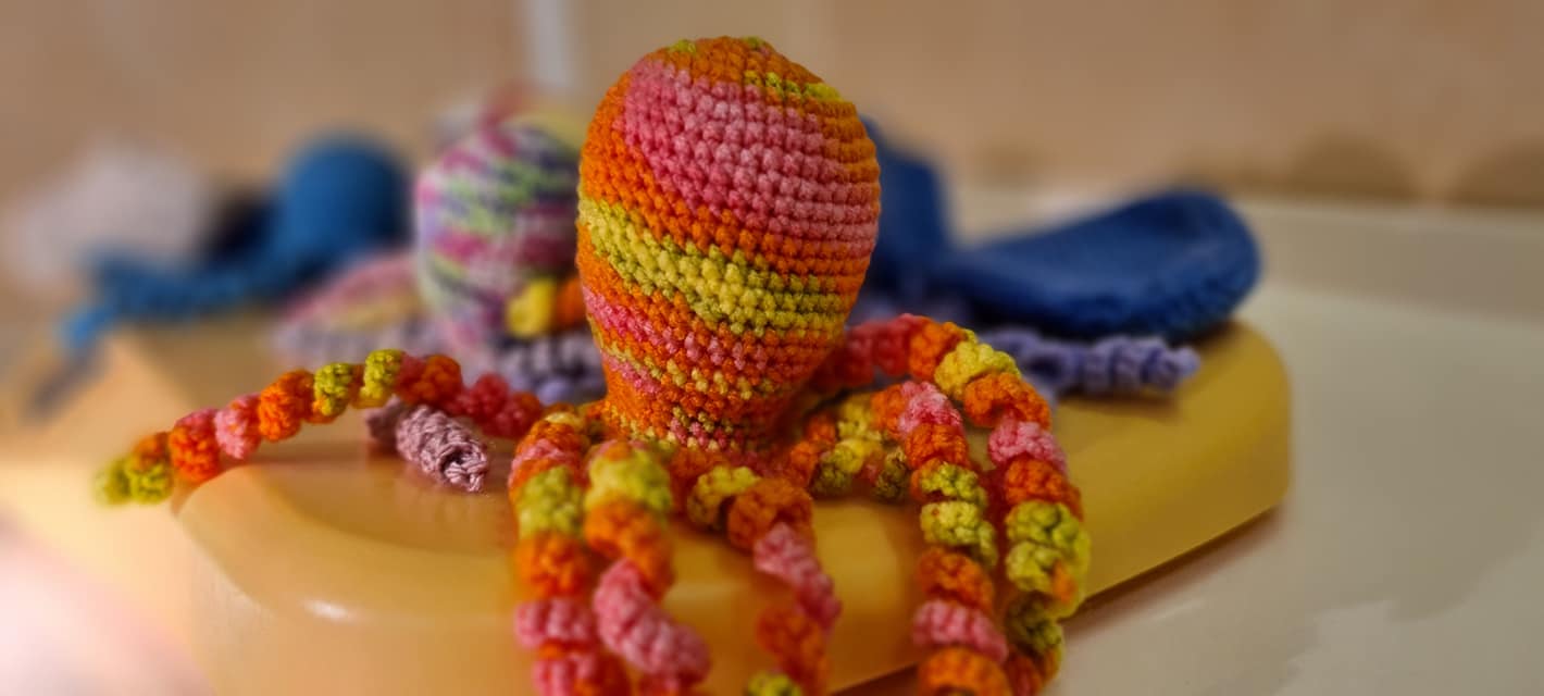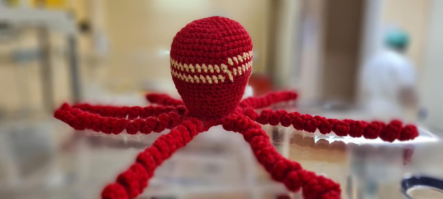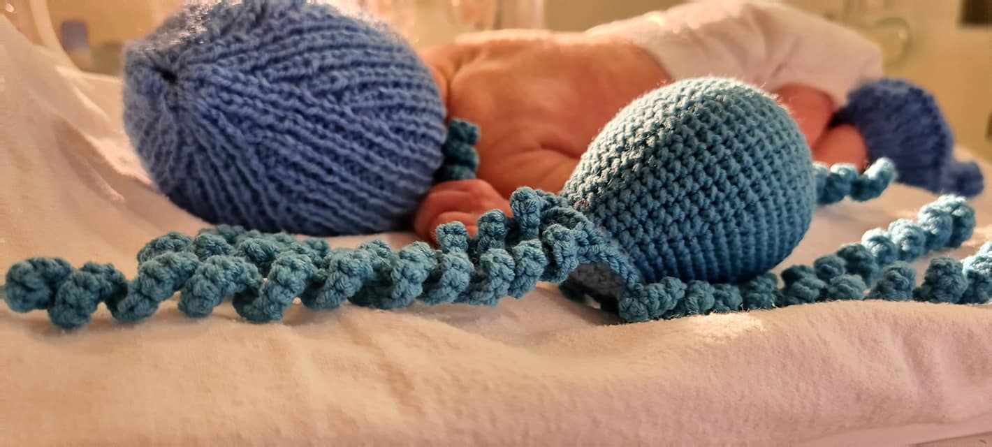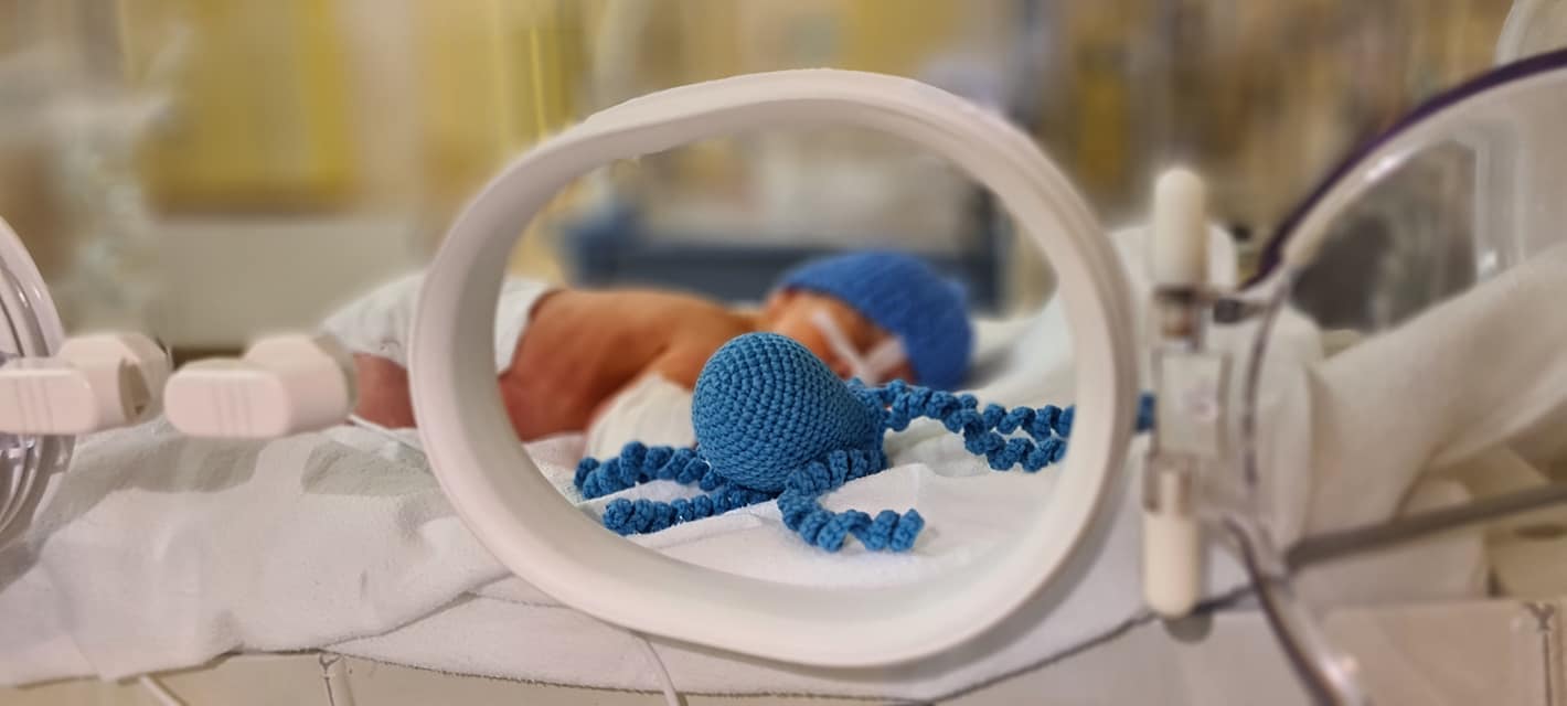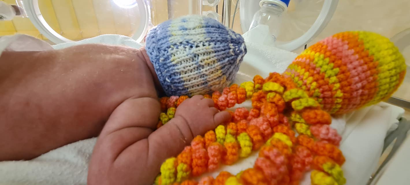 Micile caracatițe imită cordonul ombilical, iar bebelușii se simt, astfel, în siguranță. Medicul neonatolog Carmen Zaboloteanu a mulțumit voluntarilor pentru gestul frumos și a postat fotografiile pe Facebook.