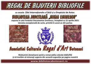 Cu ocazia Zilei Internaționale a Cărții și Drepturilor de Autor, Biblioteca Județeană ”Mihai Eminescu” Botoșani vă recomandă să vizionați, în mediul on-line, pe pagina de Facebook și pe site-ul instituției, bibliotecabotosani.ro, expoziția ”Regal de bijuterii bibliofile”. Organizată în Sala Fondului Documentar Eminescu, expoziția cuprinde donația excepțională de carte primită în acest an din partea Asociației Culturale ”Regal D’Art”.