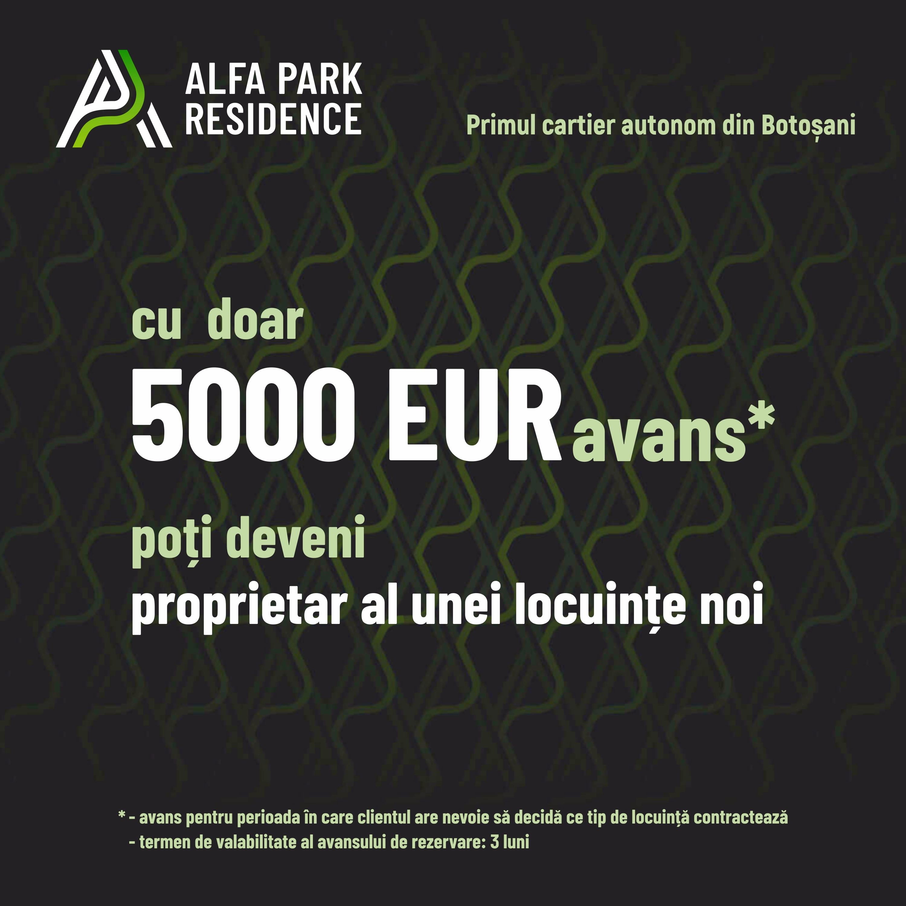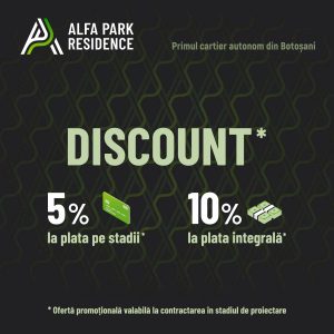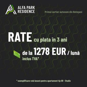Cu un minim avans de 5000 Euro, cu plata pe stadii, integrală, sau începând de la o rată lunară de aproape 1000 de Euro, cu discount-uri de recompensare a propriilor idei, poți deveni proprietar al unei locuințe noi în primul cartier autonom din Botoșani – Alfa Park Residence