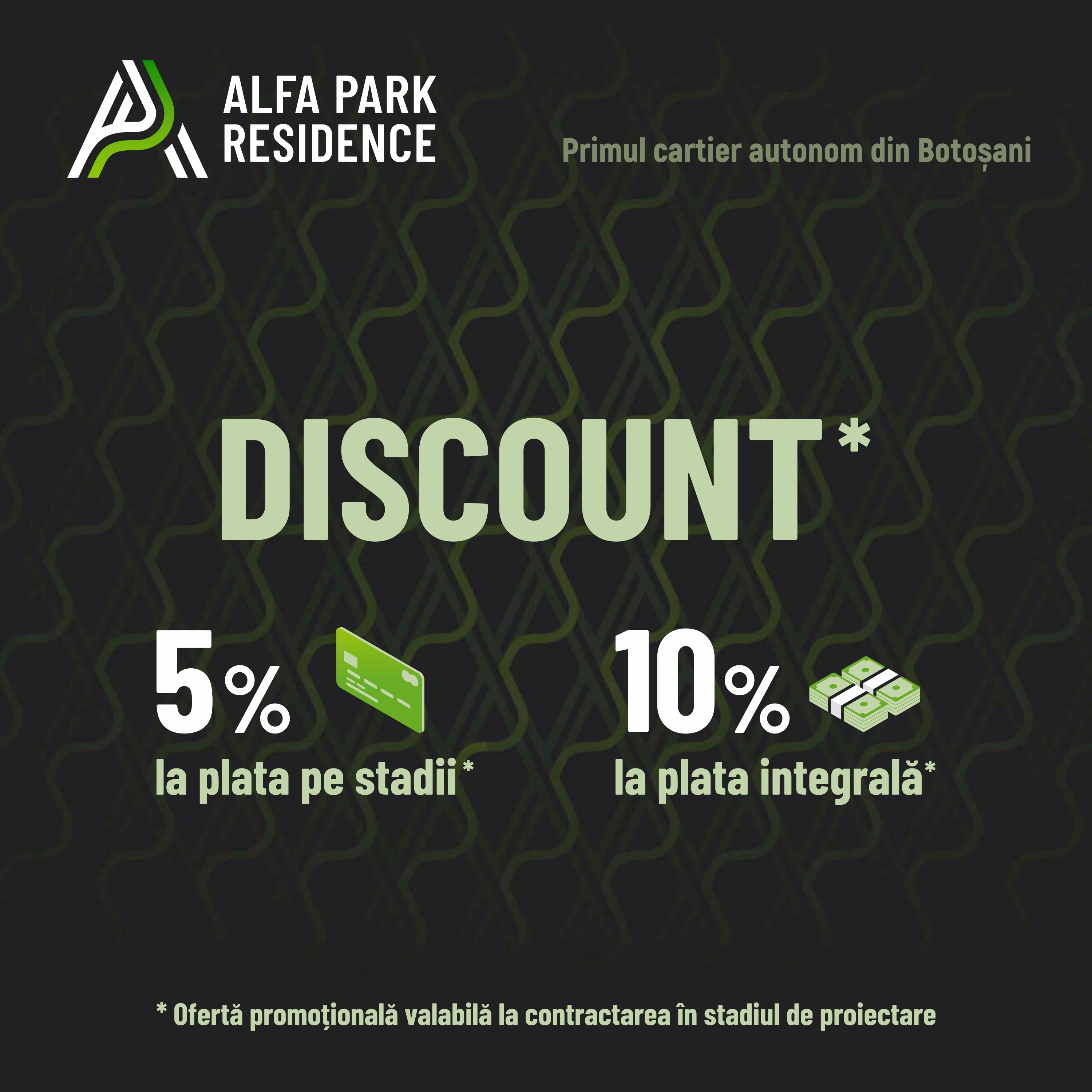 De asemenea, îi așteptăm pe toți cei care sunt interesați să își achiziționeze o casă nouă sau un apartament nou în Alfa Park Residence, să vină cu sugestii proprii de compartimentare, de personalizare a locuințelor, contribuind astfel la realizarea căminului pe care și-l doresc, idei pentru care vor fi recompensați cu: un discount de 5% la prețul de achiziție, în condițiile plații eșalonate pe stadii, iar în cazul plații integrale, vor avea avantajul unei reduceri de 10% din prețul locuinței dorite, la contractarea în faza de proiectare.” (vezi detalii Condiții Comerciale)