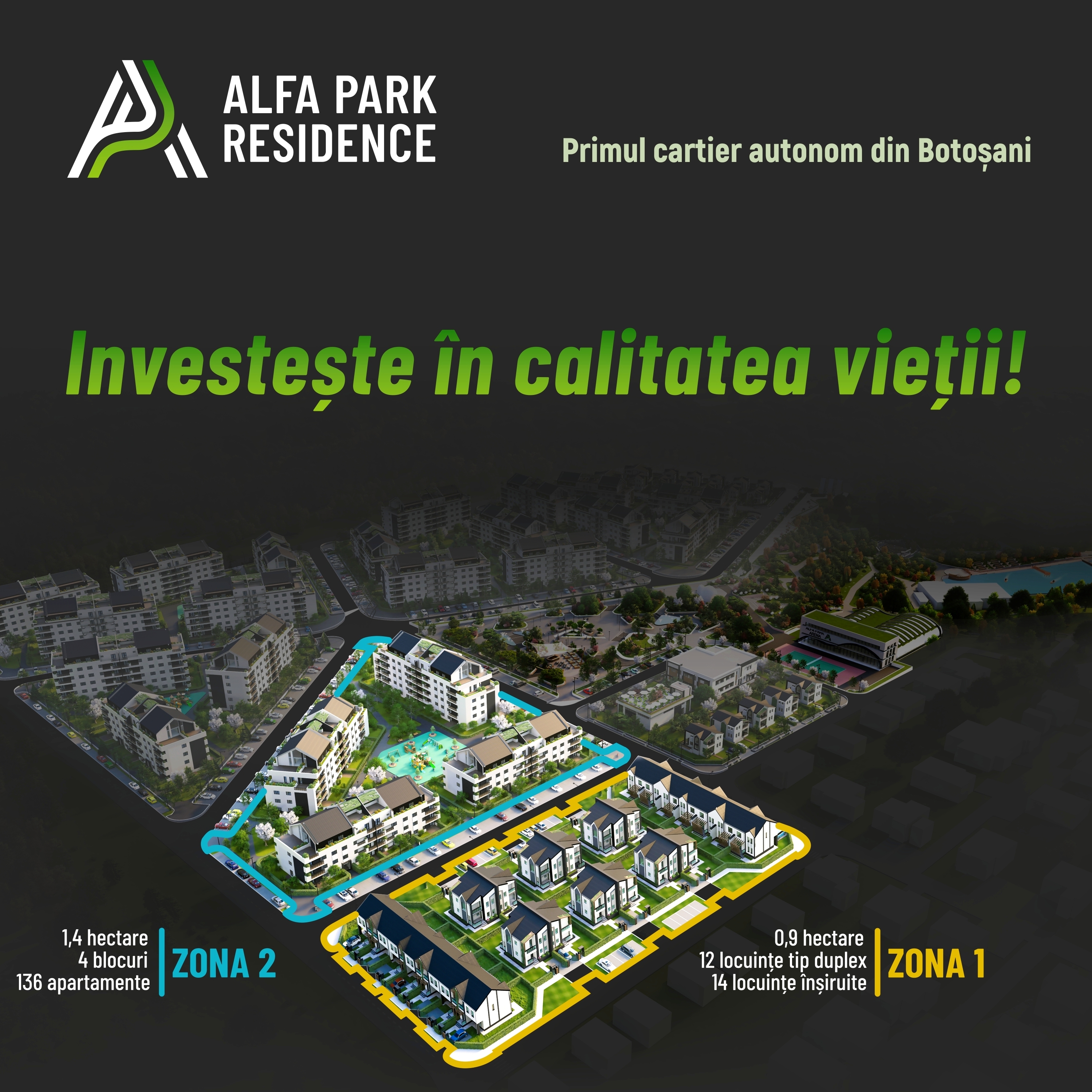 ALFA PARK Residence va îmbina confortul cu natura pe toată suprafața, integrând 46 de case și 848 de apartamente, cu spații comune de agrement și spații de servicii, cu toate facilitățile extinse de care are nevoie un complex rezidențial bine structurat, pentru a crea cartierul cu cei mai buni indicatori de calitate a vieții din Botoșani.