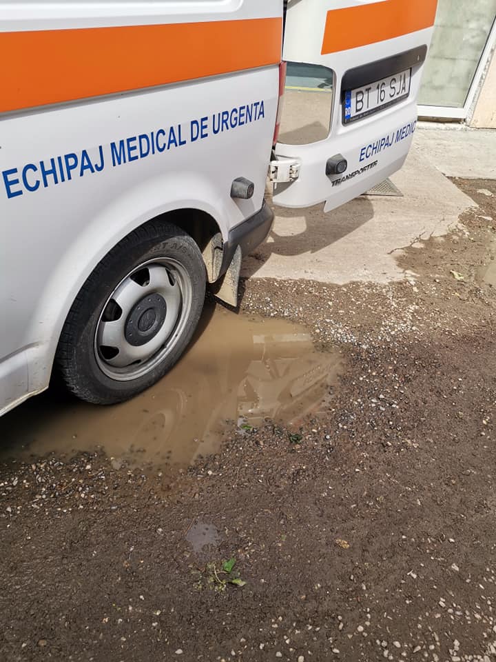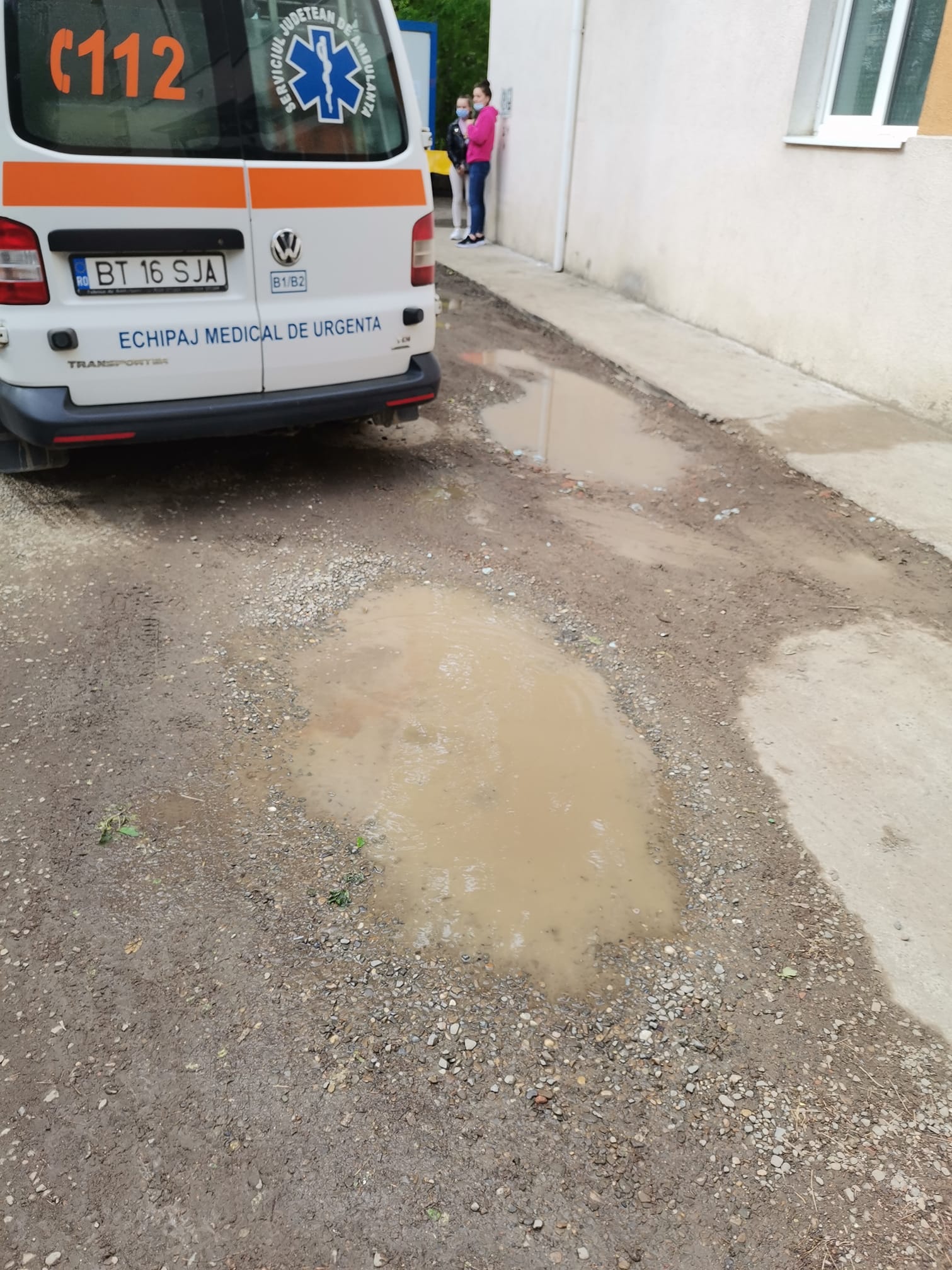 Pacienții, dar și cadrele medicale care lucrează pe ambulanțe, coboară din acestea direct în bălți atunci când ajung la intrarea de la Unitatea de Primiri Urgențe (UPU) a Spitalului Județean Botoșani. Și asta pentru că la fiecate ploaie, în gropile din fața unității se strânge apa.