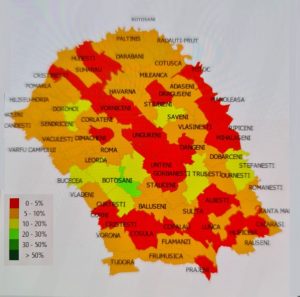 Localități roșu- sub 5% : Corni, Cristești, Coșula, Copălău, Lunca Albești, Prăjeni, Hlipiceni, Călărași, Unțeni, Gorbănești, Dângeni, Ungureni, Mihălășeni, Ripăiceni, Manoleasa, Drăgușeni, Cristești, Hudești, Mitoc